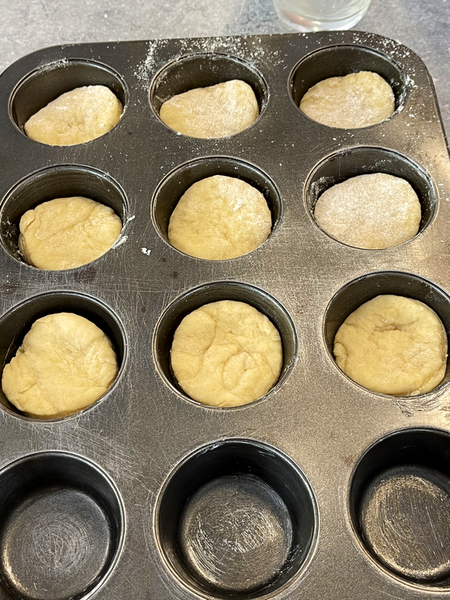 - Use the top of a narrow glass to cut out circles of dough and put them in the greased muffin tin.