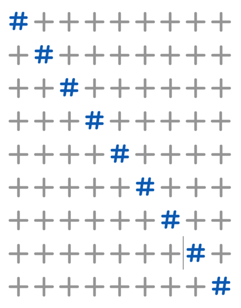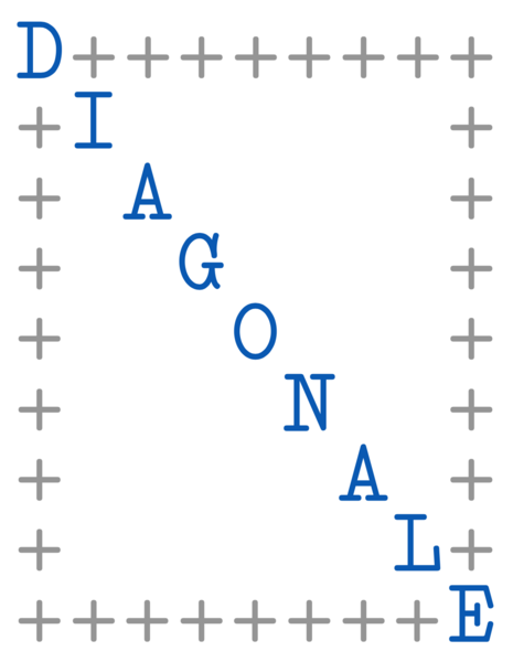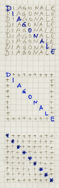 Wir benutzte als erstes die Gestaltungsprinzipien „Wiederholung” und „Flächenbildung”. Außerdem sollte das Mittel der Farbe genutzt werden. Dies steht im Normalfall auf einer Schreibmaschine nur bedingt zu Verfügung und ist deshalb neu. Rechts ein Entwurfsbeispiel zum Thema „Diagonale”.