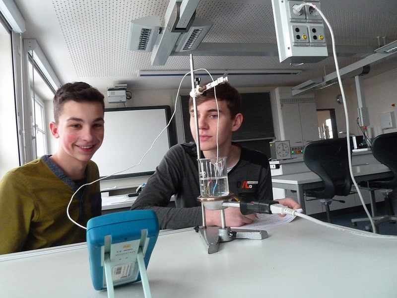 Am Zweiten Tag hatten wir noch im ersten Block normalen Unterricht und danach das letzte Thema Wirkungsgrad einer Wärmequelle. In diesem Experiment sollten wir den Wirkungsgrad einer Heizplatte bestimmen. Man befüllte ein Becherglas mit 150 ml Wasser und stellte es auf eine vorgeheizte Heizplatte. Von oben ließ man ein Thermometer reinhängen und maß die Temperatur aller 30 Sekunden bis man die 5 Minuten erreichte. Mitten in der Messung erfolgte wieder eine Kontrollmessung von den Lehren. Die Werte schrieben wir in eine Tabelle. Mit diesen Werten sollten wir nun ein Diagramm zeichnen und Aufgaben dazu lösen. Für dieses Thema hatten wir 45 Minuten Zeit.
