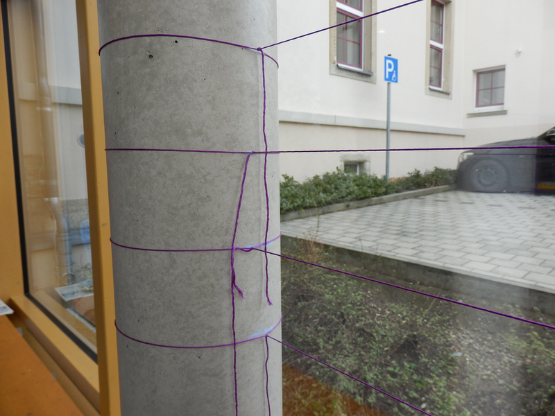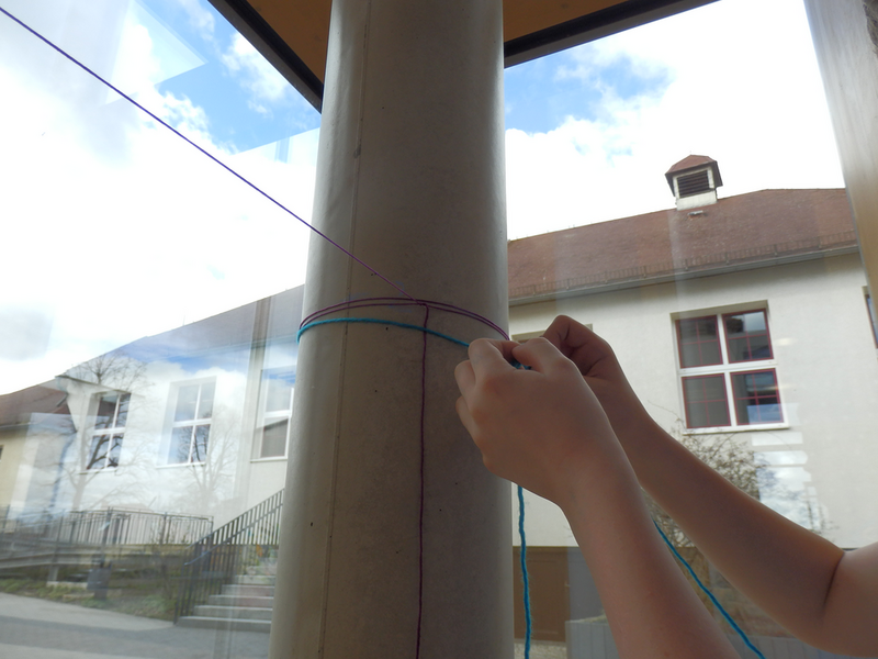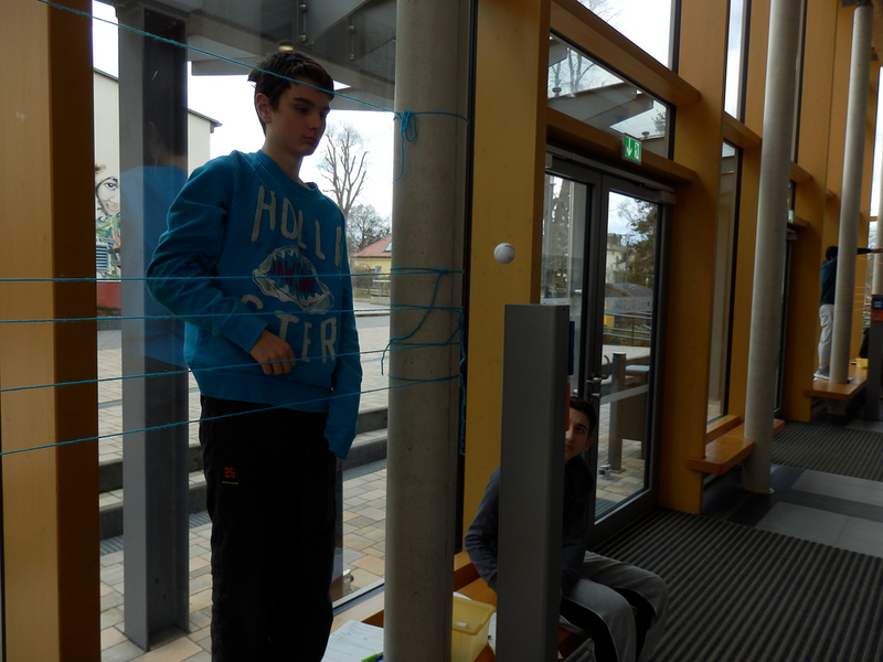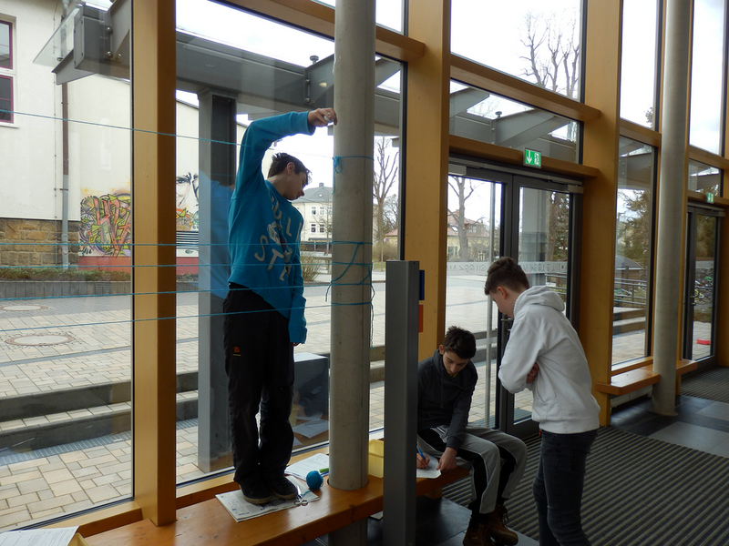 - Vorbereitung der Experimentierumgebung. Dazu wurde in unserer Pausenhalle zwischen den Säulen Fäden in verschiedenen Höhen gespannt (2,00 m, 1,60 m, 1,50 m, 1,40 m) um den Abwurf zu realisieren und die Sprunghöhe abzulesen.