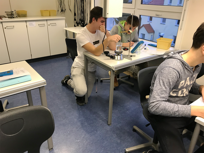 Die meisten Schüler waren gut vorbereitet und arbeiteten sehr konzentriert. Demensprechend sind die Versuchsergebnisse auch gut ausgefallen. Insbesondere die Arbeit im Team wurde im Praktikum gefordert und gefördert. Manche Schüler waren, wie auf dem Foto zu sehen auch mit ganzem Körpereinsatz dabei. Ich denke es war neben der Physik auch Spaß und Freude am Experimentieren dabei.
