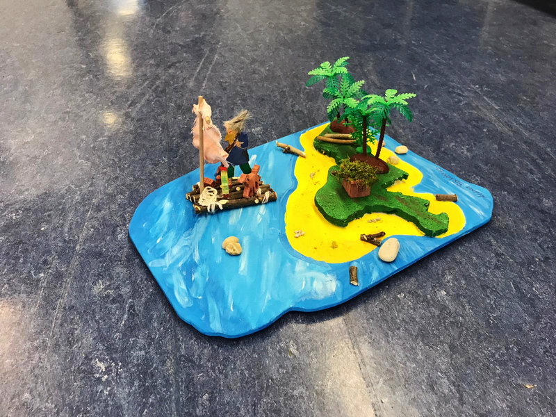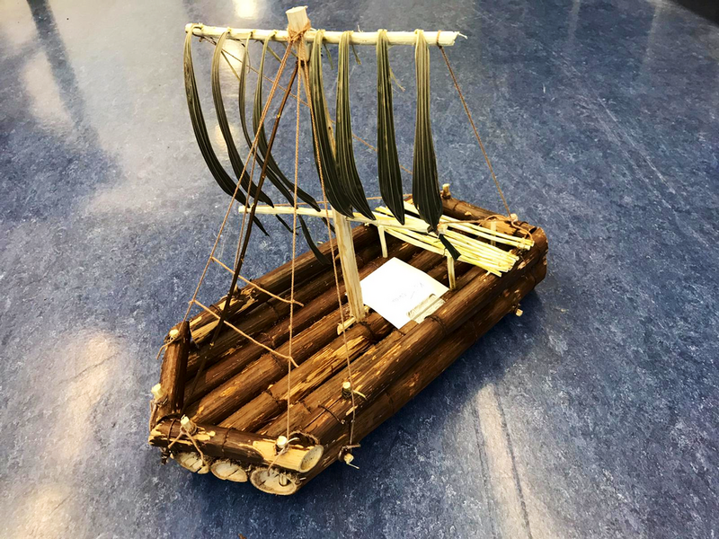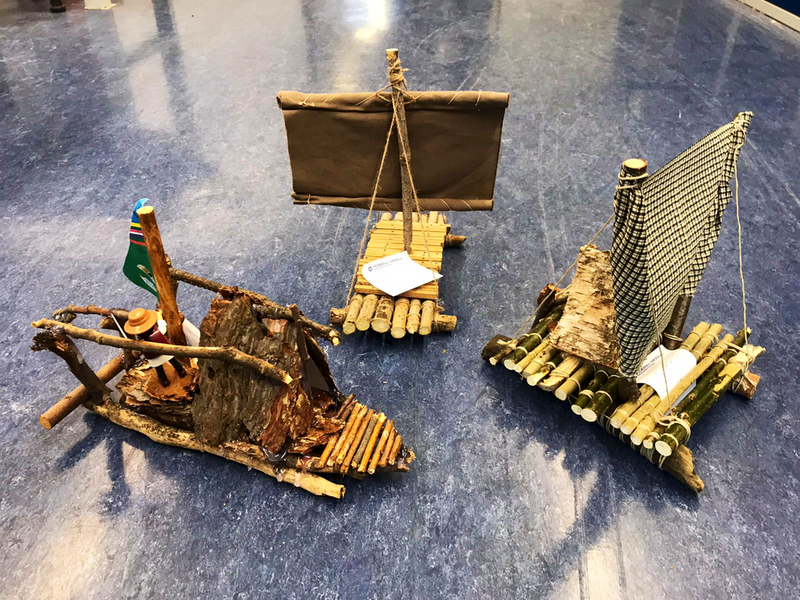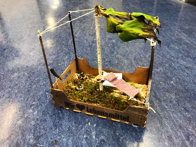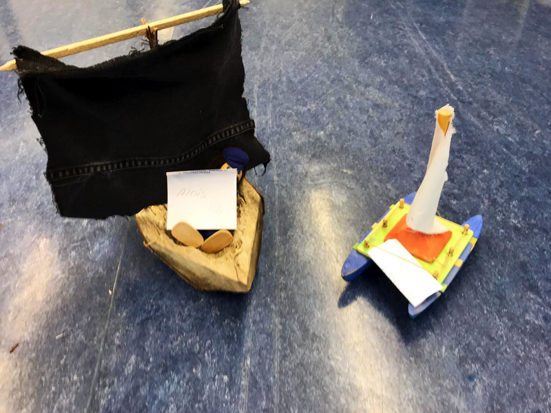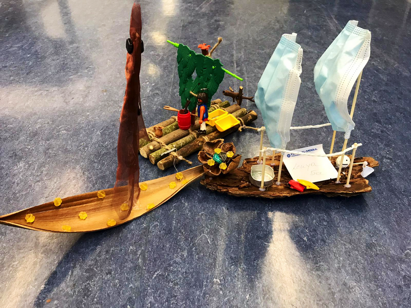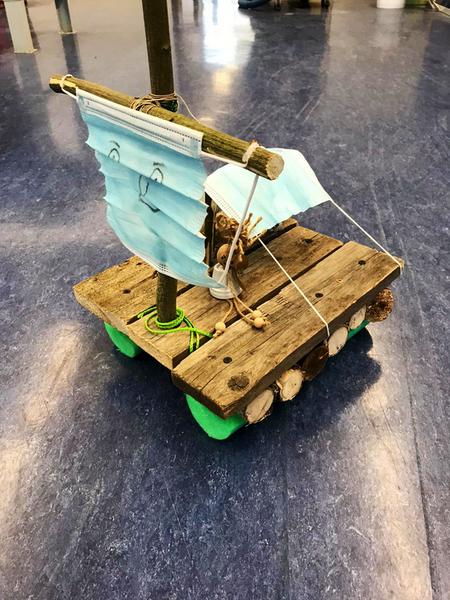 Wir haben dann die Schüler gebeten, diese in die Schule zu bringen, damit wir eine kleine Ausstellung dazu vorbereiten können. Das hat auch gut funktioniert. Und die Ergebnisse sind wirklich ganz toll geworden. Es wurde aber auch mit ganz vielen Materialien gearbeitet: Holz (mal Äste, Rinde und Zweige und auch ein ausgedienter Wanderstock musste dran glauben), ausgediente Einkaufsverpackungen, Stoffe verschiedener Art und auch OP- Masken waren da im Einsatz. Manche Floße waren schon fast Luxusyachten, andere hatten auch an Hängematte und Feuerstellen für die lange Heimreise gedacht. Und manche haben ihre LEGO- Baukästen geplündert, da waren sogar Figuren auf dem Floß. (Das gibt es natürlich alles zurück!) Wenn ich ganz ehrlich bin, bei manchen Arbeiten waren wir wirklich fast sprachlos, so toll waren die! Wir haben uns sehr gefreut, dass die Kids das so fantastisch gemacht haben. Unser Dank auch an die Eltern, die ihre Kinder so toll unterstützt haben.