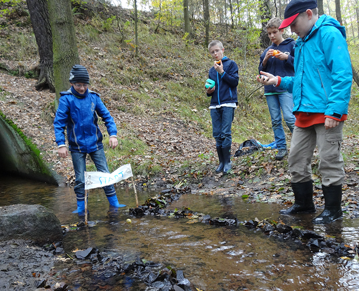 Nach dem wir einen geeigneten Bach im Wald gefunden hatten, die Rennstrecke präpariert war, konnte mit Hilfe selbst gebastelter Boote, Bandmaß, Stoppuhr und Taschenrechner die Fließgeschwindigkeit berechnet werden. Ein kleines „Wettrennen“ der Boote machte viel Spaß. Sogar ein Weg- Zeit- Diagramm entstand auf Millimeterpapier.