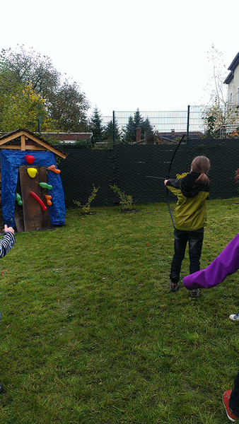 Am Mittwoch war Probentag. Wir übten, veränderten, fügten ein und waren schon etwas optimistischer mit Blick auf unser Ziel. Am Donnerstag war „Feinschliff“ angesagt. Die Waldgruppe unterstützte uns mit Ausrüstung und beim Spielen und es wurden noch Kulissen angefertigt. Außerdem haben fast alle mal mit Pfeil und Bogen geschossen. Frau Herzog war sehr froh, dass sie ihre Nahrung nicht auf diese Art und Weise erwerben muss.