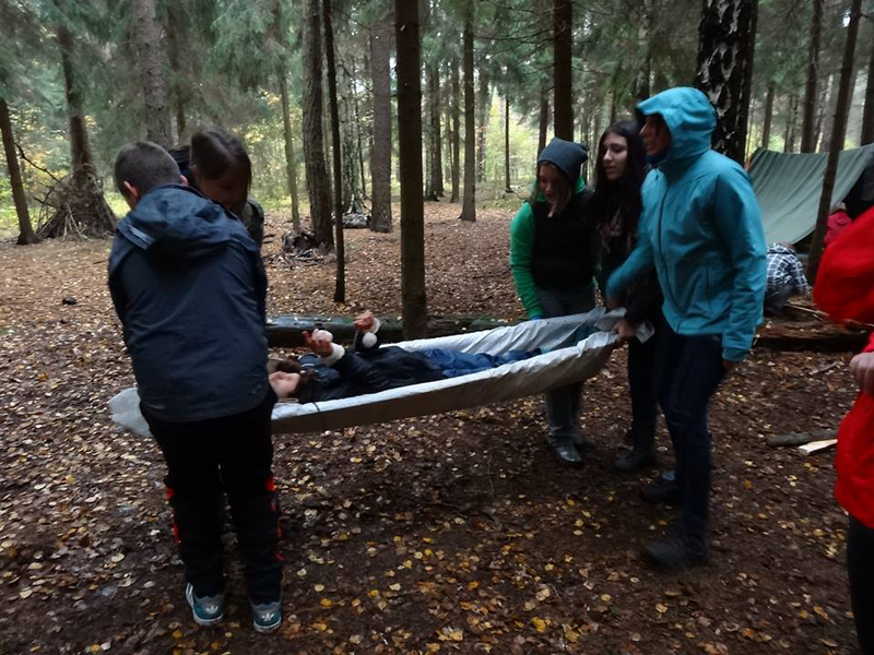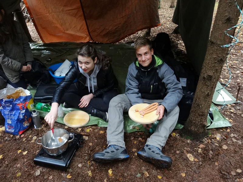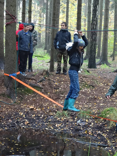 Am 13.10.13 begann unsere Projektgruppe Wildnistraining. An diesem Tag führten wir eine Kennlernrunde durch um uns besser kennen zu lernen. Wir trafen uns am zweiten Tag am Waldbad. Dieter Kunze, unser Wildnistrainer, führte uns in unser Basislager im Wald. Er lehrte uns Knotentechniken um unsere Zelte aufzubauen. Als das geschafft war, zeigte Herr Kunze uns wie man sich tarnt und Versteckt. Dann spielten wir ein spiel ähnlich wie „Verstecken“. Nach der selbstgekochten Linsensuppe bauten wir ab und der Tag im Wald war beendet. Am nächsten Tag, als das Lager aufgebaut war bekamen wir einen Einblick in das Thema gewässer- und Schluchtenüberquerung. Wir lernten auch wie man eine Trage für verletzte baut. Als Test konnten wir freiwillig einen Sumpf auf der Seilbrücke überqueren. Später wurden wir auf die Probe gestellt. Zwei jüngere Mädchen spielten dass sie verletzt wären. Wir sollten beweisen dass wir uns um verletzte kümmern, und sie transportieren können. Nach einer kurzen Regenpause und einer warmen Mahlzeit bauten wir alle zusammen das Lager ab. Nachdem wir von Herr Kunze, der uns gut betreut hat, eine Urkunde bekamen bedankten wir uns bei ihm mir einem Nahrhaften Geschenk.