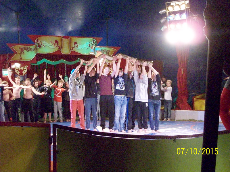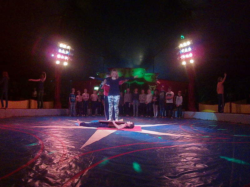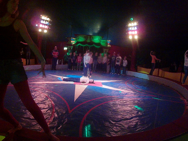 Bei den Fakiren ist die Konzentration und die Ruhe bei der Show wichtig. Deshalb wird am ersten Tag nur die Grundstellung, beide Hände aneinander legen vor dem Körper, geübt. Diese Haltung wird fast die ganze Zeit beibehalten. Nachdem das alle verstanden hatten, wurde die Schlange gezeigt, eine Tiger Python von etwa 4-1/2 m Länge und 60 kg Gewicht. Der Trainer Michel zeigte den 27 Fakiren und den 7 Seiltänzern seiner Gruppe die Glasscherben, über die sie laufen werden. Diese sind nicht abgerundet wie viele denken, sondern sehr scharf, deshalb ist die Konzentration sehr wichtig. Außerdem belehrte er die “Nachwuchsfakire” noch darüber, dass sie das laufen über die Scherben nicht zu Hause ausprobieren sollen. Nachdem der Einlauf klappte, konnten schon ein paar extra Aufgaben verteilt werden. Immer ein Junge und ein Mädchen bildeten ein Paar, der Junge liegt mit dem Rücken auf den Scherben und das Mädchen stellt sich auf seine Brust.