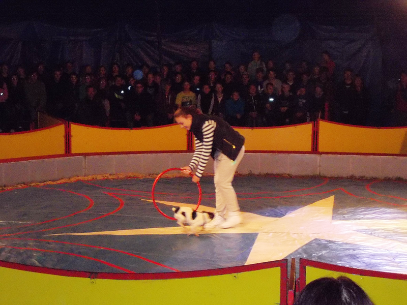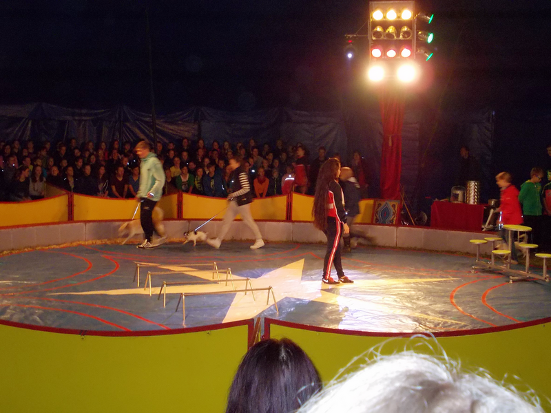 Als sich dann alle mit ihren Hunden vertraut gemacht hatten, übten sie auch schon die Tricks. Die Hunde sind die treusten und liebsten Tiere der Menschen, das sieht man auch an der Zusammenarbeit zwischen Tier und Mensch. Am Anfang springen die Hunde über Hürden, dann hüpfen einige Hündchen durch einen Ring. Dann soll auch der kleine Brutus durch den Ring springen. Allerdings war der Ring viel zu hoch gehalten für den kleinen Brutus. Der legt sich erst mal ganz gemütlich hin. Scalett fragt Benji (ein anderer Hund) warum Brutus nicht springen will. Benji bellte und Scalett übersetzt, das Brutus ohne Applaus nichts macht. Das Publikum applaudiert ganz laut und Brutus springt. Danach rutschen die Hunde auf einer Rutsche was ihnen sichtlich Spaß macht. Das bestätigt auch Benji. Scalett übersetzt noch das Brutus wieder mal nicht mit gemacht hat, weil er Angst hat das die anderen Hunde ihn schuppsen könnten. Mit Applaus rutscht aus Brutus gern.