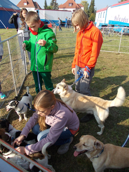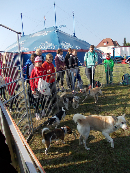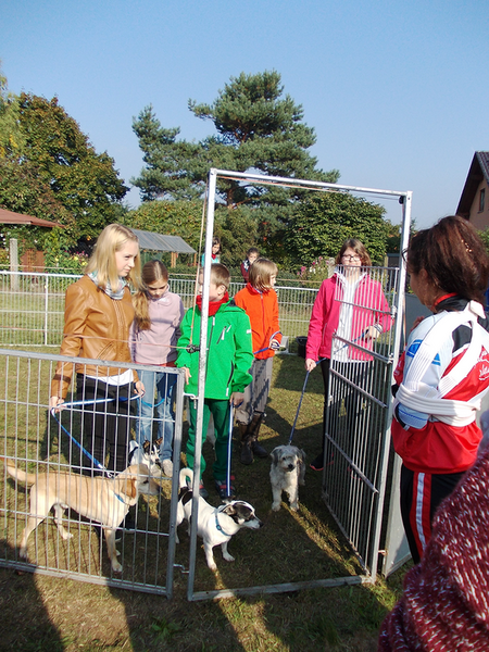 Die Gruppe besteht aus 11 Kindern die jeweils Zweiergruppen bilden. Zuerst haben die Kinder die Hunde angeleint und sind mit ihnen Gassi gegangen. Die sieben Hündchen wollten gleich über den ganzen Platz rennen und alles erkunden.