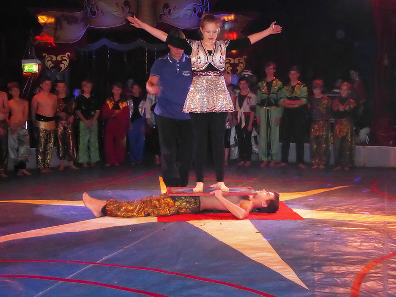 Dennoch begann die Vorstellung wiedr verspätet, und erneut starteten die Akrobaten die Show mit einem sensationellen Auftritt. Auch die Hundedressur konnte die atemberaubende Leistung vom Vortag konservieren. Wer dachte, das gelingt den anderen Gruppen nicht, sah sich getäuscht. Die komplette erste Hälfte war nahezu perfekt und die Zuschauer zu Recht begeistert.
