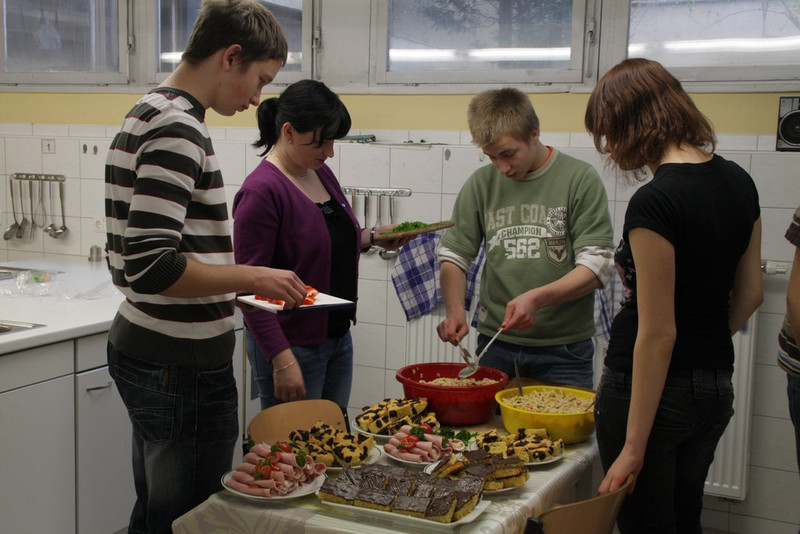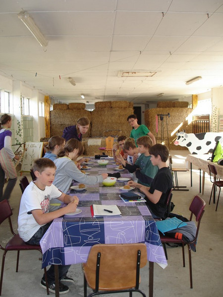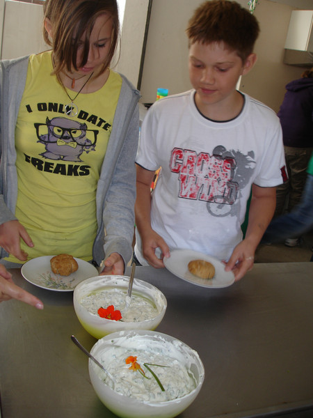 Im September besuchte der Kurs den Schulbauernhof in Weixdorf und wurde dort DANK (!) der engagierten Arbeit von der Leiterin Frau Frommhagen über Berufe und Möglichkeiten der Berufsausbildung in der Landwirtschaft informiert. Und damit die Informationen auch gleich anschaulich verarbeitet werden konnten, machten die Schüler einen kleinen Rundgang und bekamen einen Einblick, welch vielfältige Lebensmittel in der Landwirtschaft hergestellt werden. Da dieser Unterrichtsgang über die Mittagszeit stattfand, bot es sich geradezu an Brötchen selber zu backen, einen Kräuterquark und Kräutertee her zu stellen – mit selbstverständlich von den Schülern frisch gepflückten und erlesenen Kräutern. Weder vom Quark, noch von den Brötchen oder dem Tee blieb etwas über, also scheint es allen gut geschmeckt zu haben. Aber manchmal sagen Bilder mehr als Worte.