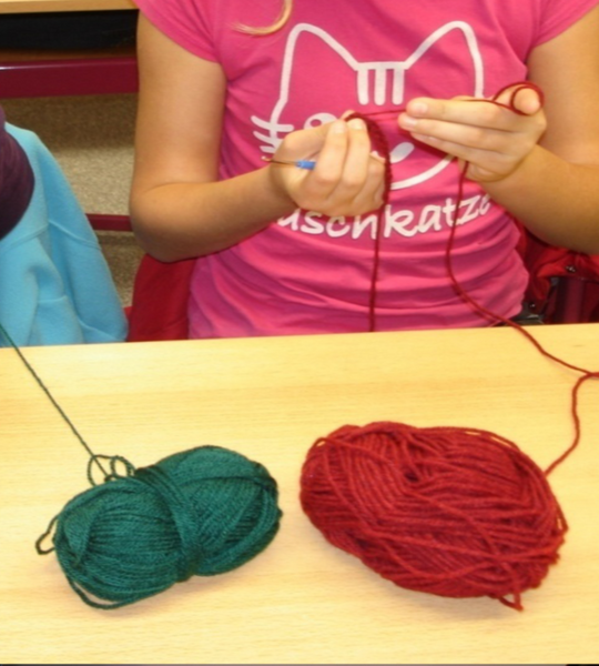 Nach dieser Vorstellung des Neigungskurses im vergangenen Schuljahr meldeten sich 13 Jungen und Mädchen dazu an. Entsprechend den Neigungen und Interessen der Schüler/innen wurde dann der Kursinhalt verfeinert und so steht jetzt im Mittelpunkt des Kurses das Erlernen verschiedener Handarbeitstechniken. Dazu werden die Schüler sich Grundkenntnisse im Häckeln und Stricken aneignen bzw. ihre Fähigkeiten erweitern. Kleine Weihnachtsüberraschungen sollen entstehen und die Kenntnisse an der Nähmaschine werden auf neue Art und Weise zu interessanten Ergebnissen führen.