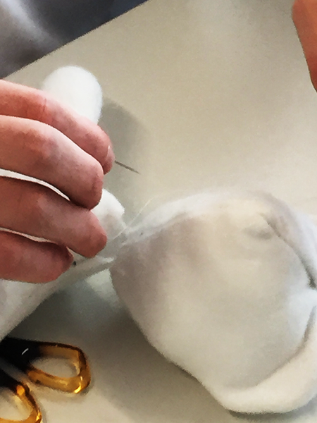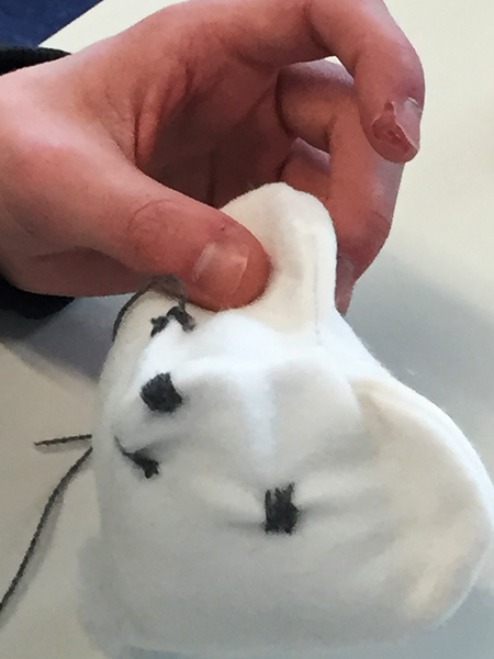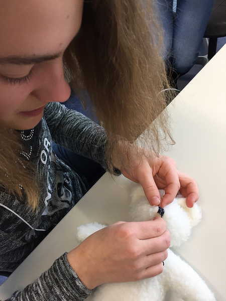 Den Kopf nähten wir aus drei Teilen zusammen und drehten ihn wieder um. Das klappte viel besser als beim Körper. Nun konnten wir mit Watte alles ausstopfen und die Ohren abnähen. Spätestens jetzt konnte man den Teddybären erkennen. Wir nähten den Kopf an den Körper und stickten mit Wolle die Augen, die Nase und den Mund. Dadurch sahen dann alle Teddybären ganz unterschiedlich und individuell aus. Als Augen hätten wir auch Knöpfe nehmen können, aber die meisten wählten lieber die Wolle.