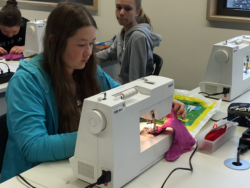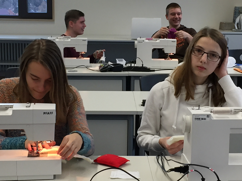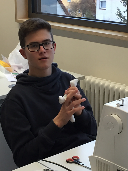 Zuerst wählten wir einen Stoff aus und schnitten die Teile mit den Schablonen aus. Dann mussten wir den Körper mit der Nähmaschine zusammennähen und umdrehen. Das fiel einigen gar nicht so leicht, da manche Nähte wieder aufrissen. Doch mit gegenseitiger Hilfe, schafften es dann alle.