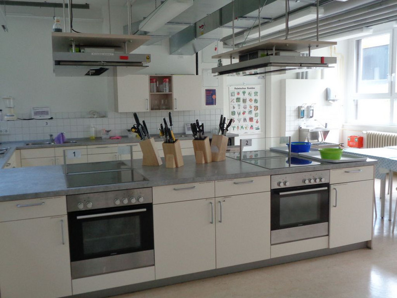 Im Bereich der Ernährungslehre geht es u.a. um die Lebensmittel als Nährstoffträger, den Nährstoff- und Energiebedarf, die vollwertige Ernährung, Essstörungen und natürlich auch um das Herstellen von vielseitigen und ausgewogenen Mahlzeiten. Die Schüler lernen dabei verschiedene Garmethoden kennen. In vier Gruppen arbeiten sie dabei in unserer modernen Lehrküche.