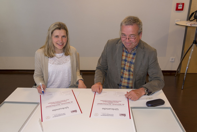 Im Rahmen eines "Pädagogischen Tages", an dem rund 25 Lehrer aus der Oberschule das UKD besuchten, wurde die Kooperation schließlich offiziell besiegelt: Kerstin Schaffer, Leiterin des Bereichs Recruiting und Entwicklung im Geschäftsbereich Personal und Recht und Herr Lange, Schulleiter der 25. OS, unterzeichneten die Urkunde und bekräftigten so die Absicht, die Zusammenarbeit fortzuführen.