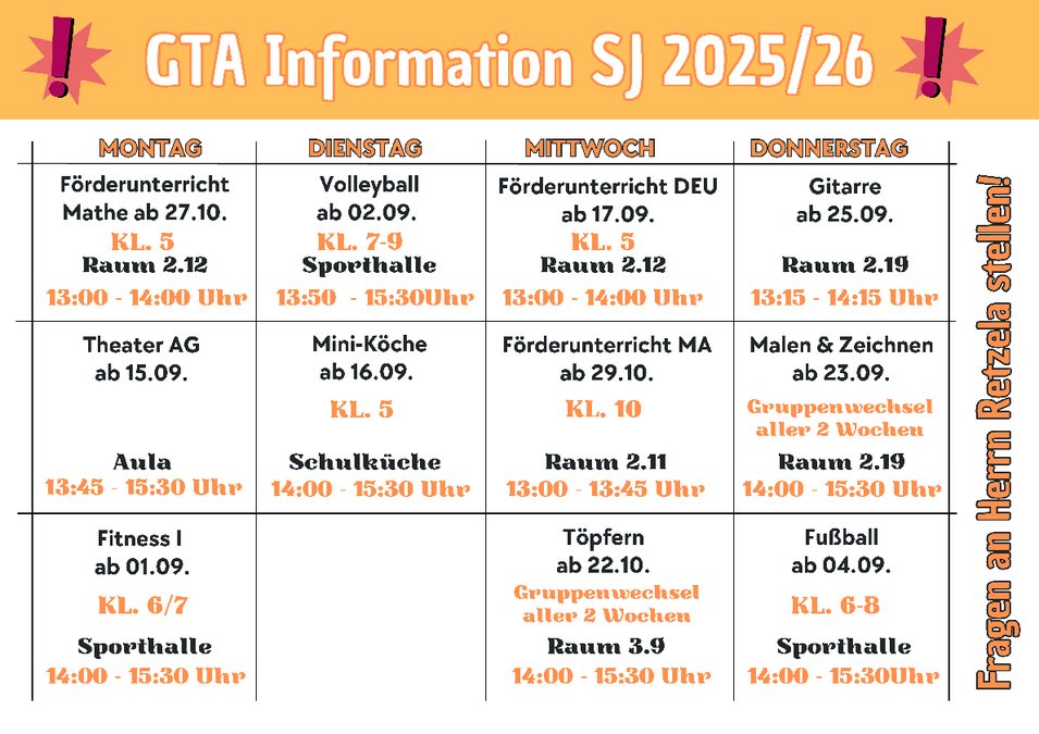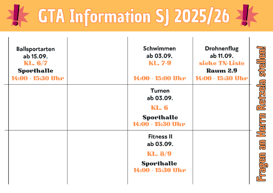 Ganztagsangebote als freiwillige unterrichtsergänzende Bildungs-, Unterstützungs- und Betreuungsangebote erweitern das Spektrum an Möglichkeiten, den Erziehungs- und Bildungsauftrag unserer Schule umzusetzen. Wissenserwerb, Kompetenzentwicklung und Werteorientierung werden in den Ganztagsangeboten fortgeführt. Diese zusätzliche individuelle Förderung leistet einen wichtigen Beitrag zur Persönlichkeitsentwicklung der Schüler unserer Schule. Sie unterstützt den Ausbau von Stärken und hilft, vorhandene Schwächen abzubauen. Schüler erhalten Gelegenheit, Interessen, Talente und Neigungen zu entdecken bzw. zu entwickeln und ihre Freizeit sinnvoller zu gestalten.