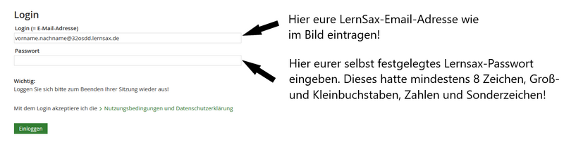- Der Anmeldename ist gleichzeitig die LernSax-Emailadresse und wird von der Schule