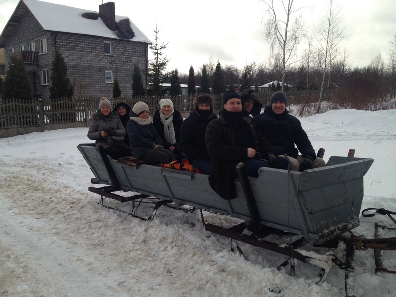 Nachdem wir am Mittwoch das in Krakau Erlebte mittels Workshops ausgewertet hatten und zahlreiche Collagen und Plakate entstanden waren, ging es am Donnerstag auf den Biobauernhof Przybynow, wo unsere Schüler erst selbst eine Kuh melken durften und die so gewonnene Milch anschließend auch gleich in Butter verwandelten, die wir auf frischem Brot genüsslich verspeisten. Am Nachmittag fuhren wir mit dem Pferdeschlitten durch die traumhafte Winterlandschaft Schlesiens. Wieder in Sosnowiec angekommen, ging es für die Schüler mit ihren Gasteltern zum Stadtbummel, ins Schwimmbad oder gar ins Fitnessstudio.