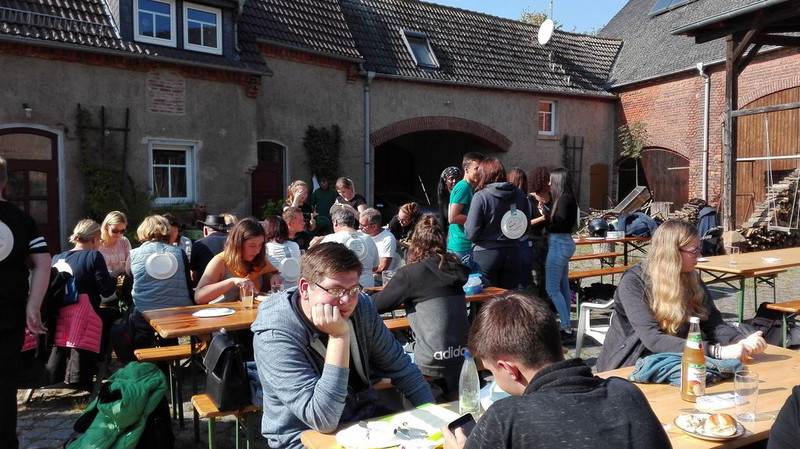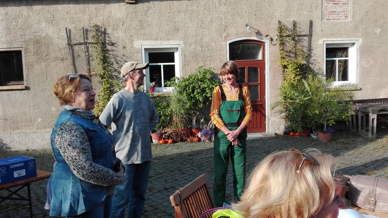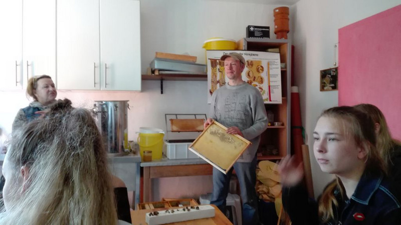 Am letzten Tag besuchten alle den Ökobauernhof Prautzsch/ Praters in Krippehna. Nach der Begrüßung und den Informationen über die Rinderrasse German Angus und deren Aufzucht und den angebauten Getreidesorten wurde die Gruppe geteilt. Es ging ans Steinesammeln auf den Feldern, die Vorbereitung der Neusaat und das Verarbeiten von Bio-Äpfeln zu leckeren Mus. Die andere Gruppe erfuhr sehr viel Interessantes von Herrn Prater, der Honigbienen besitzt und auch als Schulimker tätig ist.Mit entsprechender Kleidung wurde sogar ein Stock geöffnet und die Königin entdeckt. Für die Übersetzung in´s Englische half an diesem Tag Frau Zschüntzsch, eine ehemalige Englischlehrerin unserer Schule. Dann wurde gewechselt und zur Mittagszeit trafen sich alle auf dem historischen Bauernhof. Dort fand die Auswertung der Woche statt und Frau Praters hatte für ein deftiges Essen gesorgt. Dieser Vormittag war sehr informativ und der Familie Praters und Herrn Prautzsch ein herzliches Dankeschön! So ging eine ereignisreiche Woche zuende, in der viel erlebt, gelernt und Freundschaften gepflegt wurden.