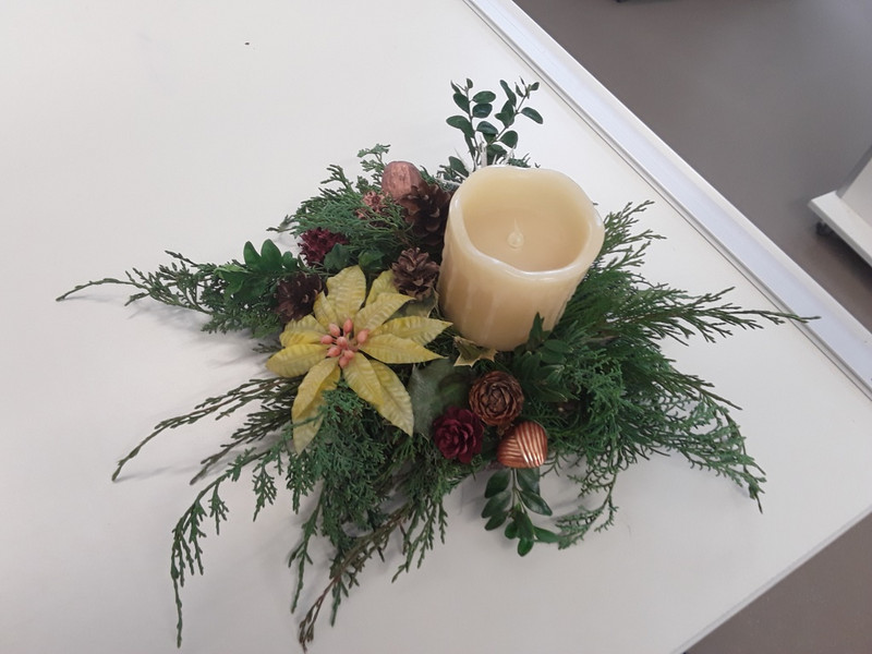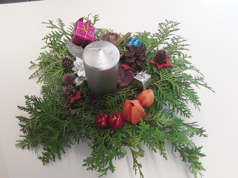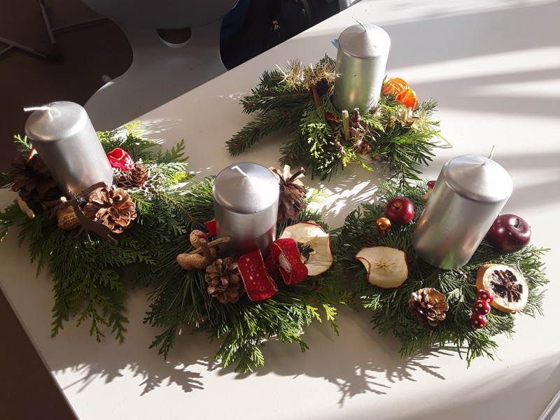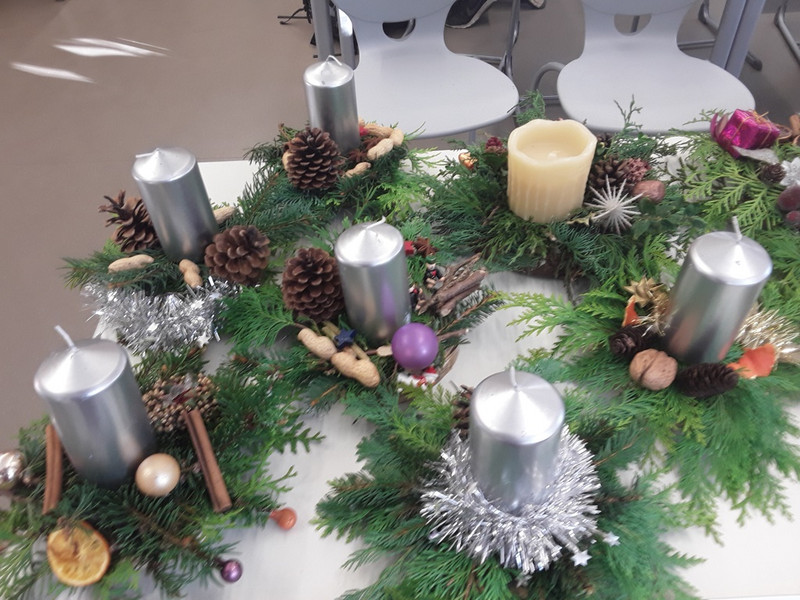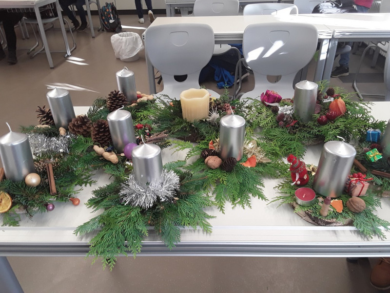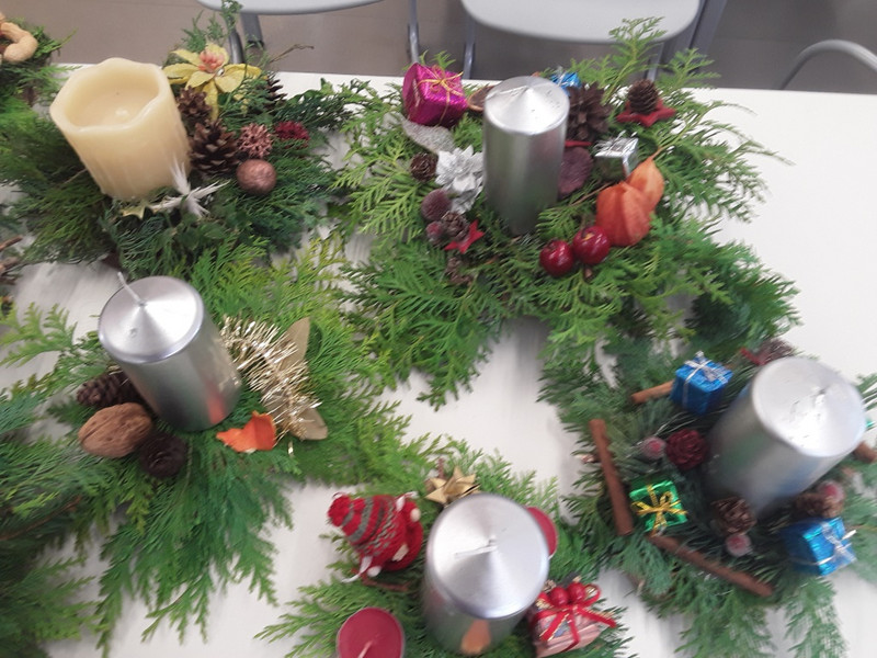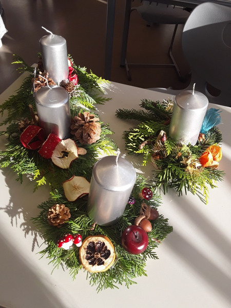 Wir basten Weihnachtsgestecke mit Naturmaterialien.