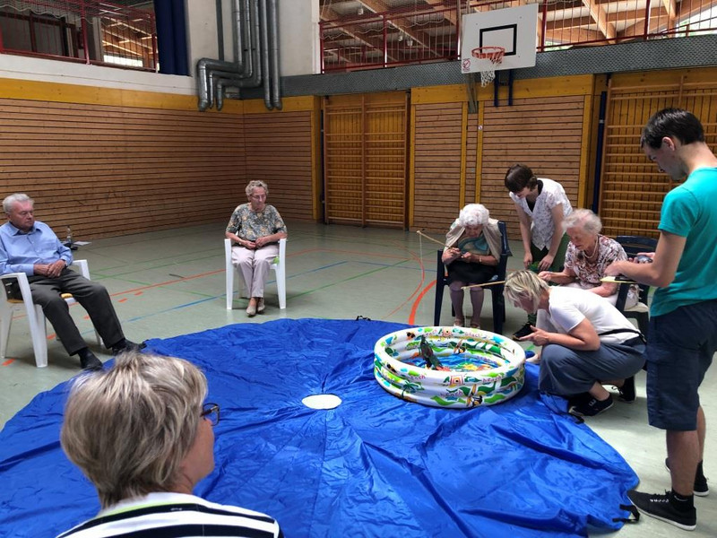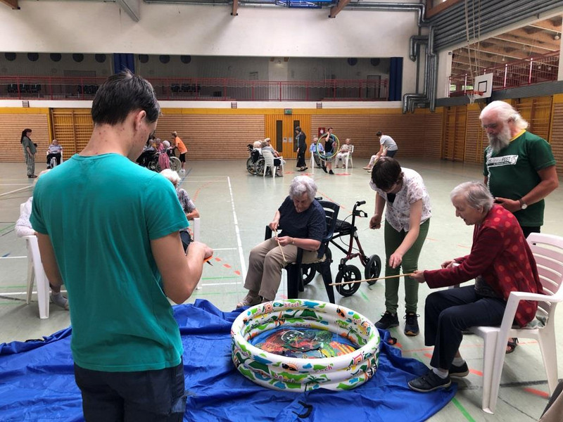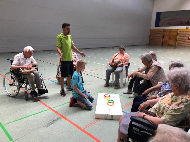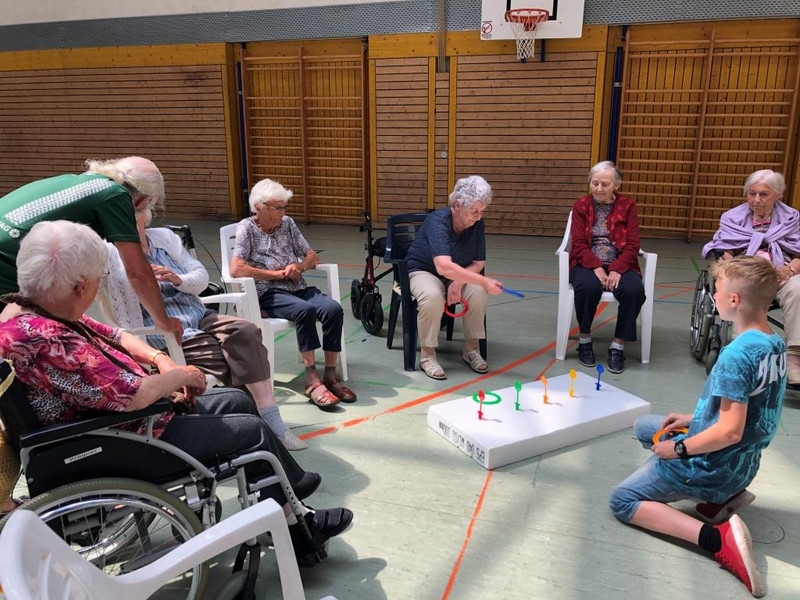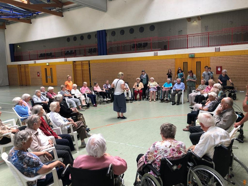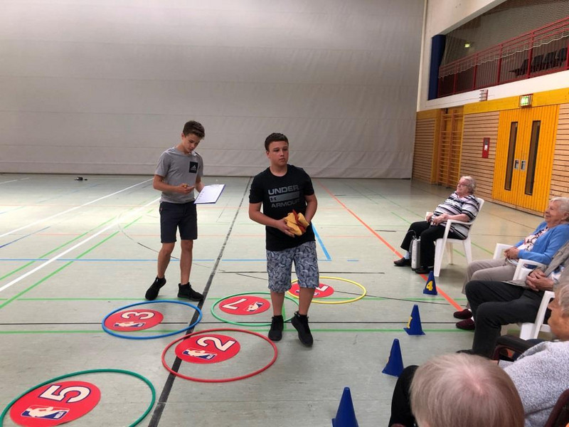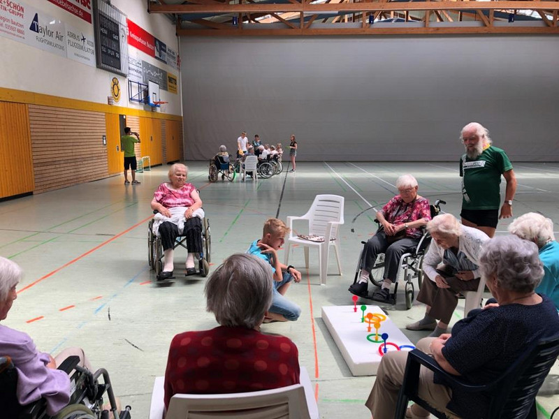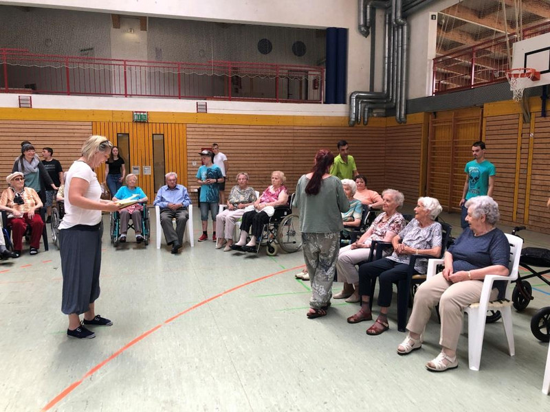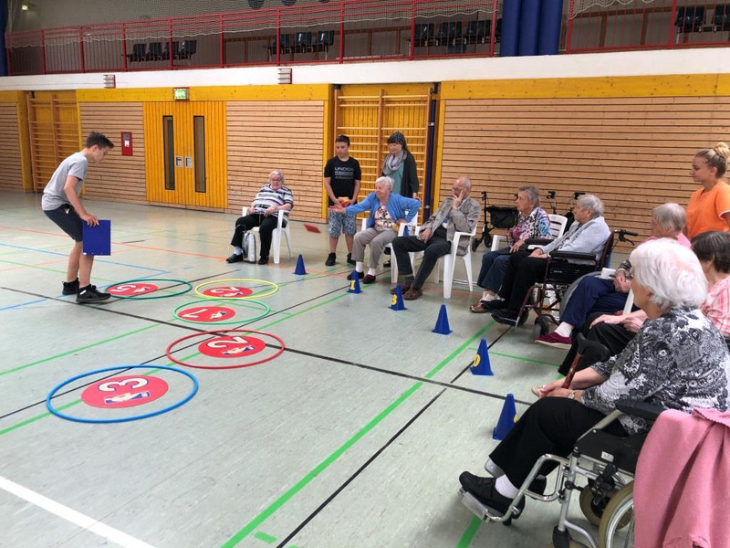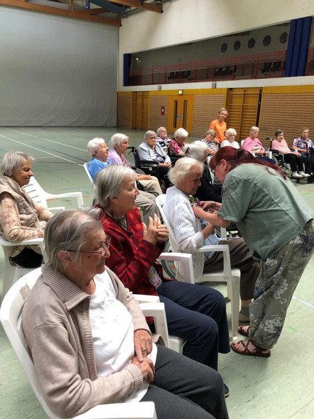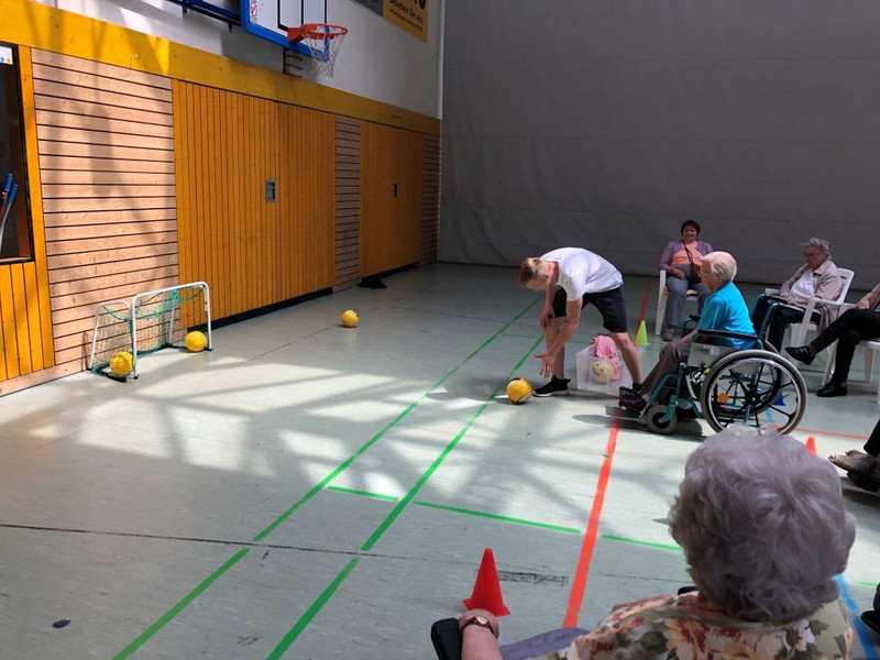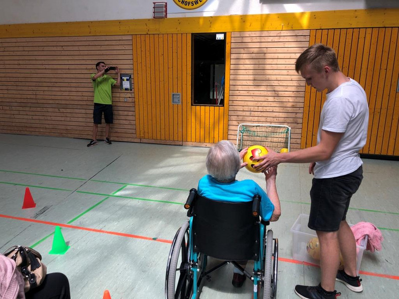 Um in die Turnhalle zu kommen, musste viel organisiert werden. Vor allem der Transport der Heimbewohner musste genau geplant werden. Unsere Schüler und auch das Pflegepersonal machten dies möglich. Die Bewohner wurden in ihren Rollstühlen im Heim abgeholt und zur Turnhalle geschoben, andere mit dem Kleinbus transportiert.