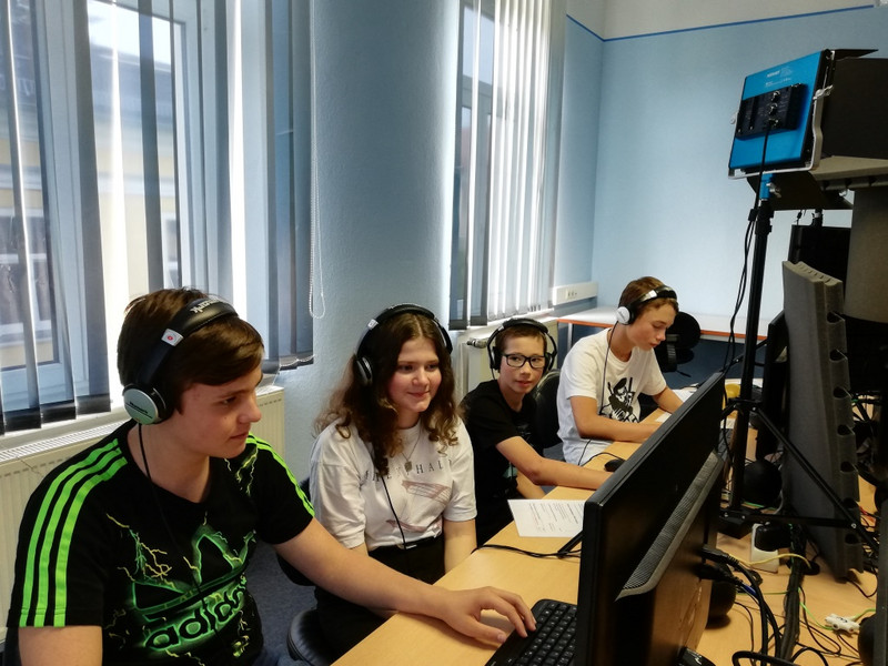 Einige ausgewählte Schüler der Klasse 8b waren am 15. Juli beim SAEK in Bautzen, um einen Podcast über unsere Schule aufzunehmen. Dazu haben sie sich im Vorfeld über die Geschichte unserer Schule genau informiert und das gemeinsame freie Sprechen geübt. Das Aufnehmen des Podcasts dauerte mehrere Stunden, denn die einzelnen Gesprächsabschnitte mussten anschließend geschnitten und abgemischt werden.