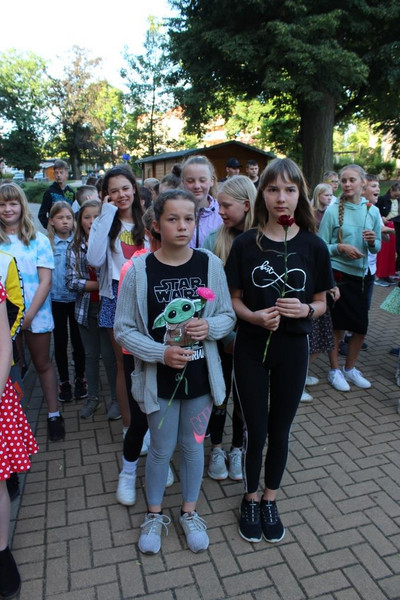 Alle Klassensprecher haben sich bei ihr mit Blumen bedankt und die gesamte Schulgemeinschaft mit einem abschließendem Flashmob zum Lied "Macarena".