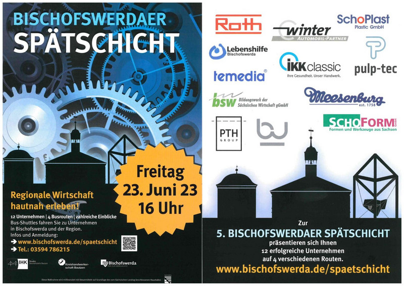 Am 23. Juni 2023 öffnen Wirtschaftsunternehmen sowie soziale Einrichtungen in Bischofswerda und Umgebung zum fünften Mal Türen und Tore für interessierte Besucher. Werfen Sie einen Blick hinter die Kulissen von insgesamt 12 Unternehmen/Einrichtungen, und erfahren Sie vieles Wissenswertes über die Geschichte, Leistungsfähigkeit, Produktion, Ausbildungsmöglichkeiten und offene Stellen.