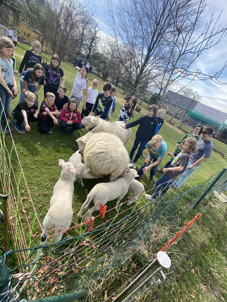 Passend zum aktuellen Thema im Biologieunterricht konnten die Kinder Wachteln, Enten und Hühner aus nächster Nähe beobachten. Wer genau hinschaute, entdeckte Unterschiede im Gefieder, im Verhalten und in der Größe der Tiere – ein spannender und lebendiger Biologieunterricht mitten in der Natur. Ein besonderes Highlight für viele: Die Lämmchen durften gestreichelt werden und sorgten für strahlende Kinderaugen.