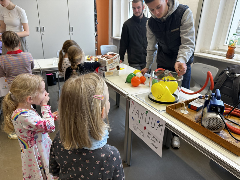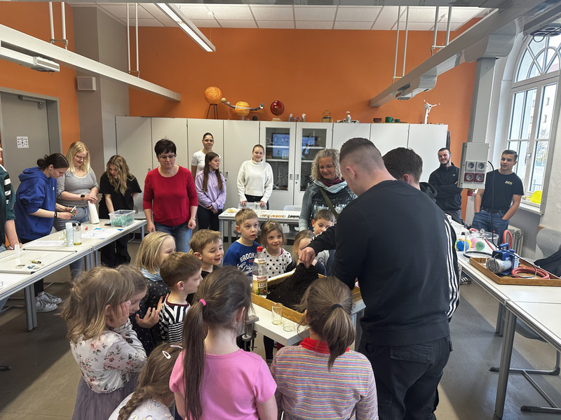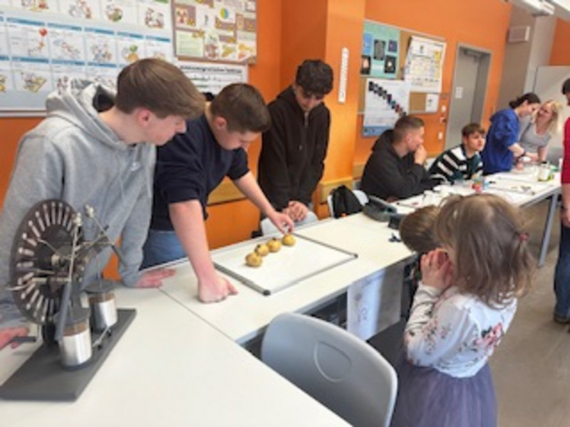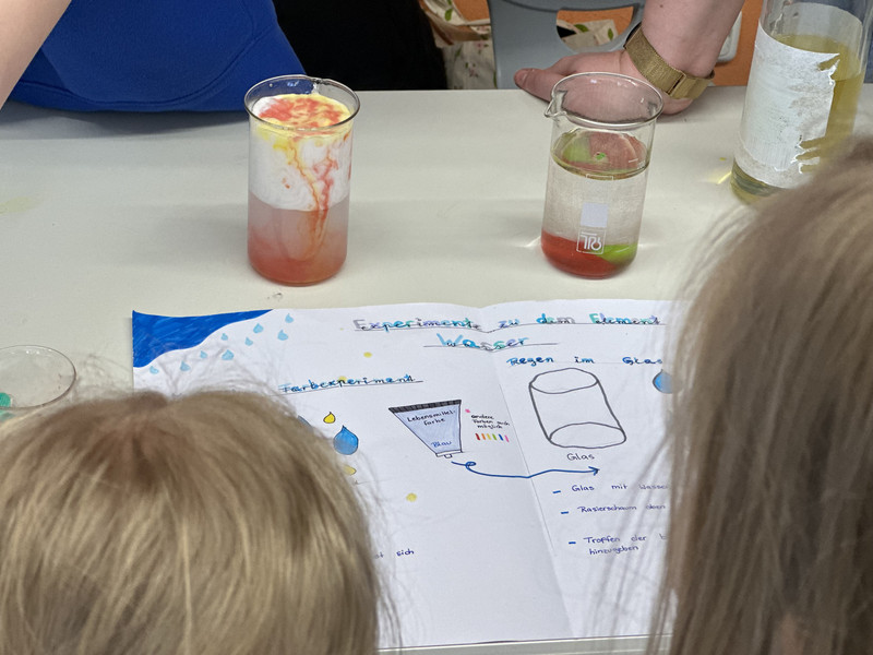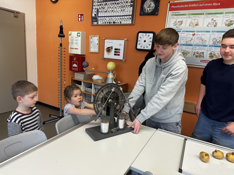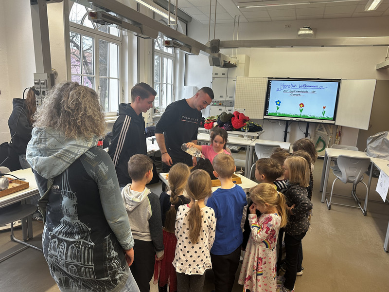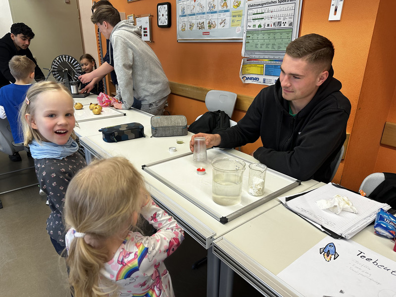 Die letzte Physikstunde vor den Prüfungen nutzte die Klasse 10d für eine Experimentiersafari zu den Elementen Feuer, Erde, Wasser und Luft. Dazu hatten die Schülerinnen und Schüler die Vorschulkinder aus der Kita Märchenland eingeladen. Schnell waren im Vorfeld viele Ideen für Experimente gesammelt, Absprachen getroffen und letztendlich das Physikzimmer umgeräumt. Mit großer Begeisterung experimentierten die Kleinen mit den Großen und die Großen mit den Kleinen. Fleißig wurden viele Forscherfragen gestellt und altersgerecht beantwortet. Untersucht wurden Feuer und Blitz, elektrischer Strom, Oberflächenspannung von Wasser, Licht und Farben, wie Luft Wasser verdrängt, Lavalampen funktionieren und ein Vulkan ausbricht. Eine Teebeutelrakete wurde gestartet und Wasser bei Zimmertemperatur zum kochen (die Großen sagen zum Sieden) gebracht. Zum Abschluss wurde auf dem Schulhof ein Freiluftexperiment durchgeführt. Gespannt beobachteten alle, was passiert, wenn Mentos in eine Colaflasche fallen.