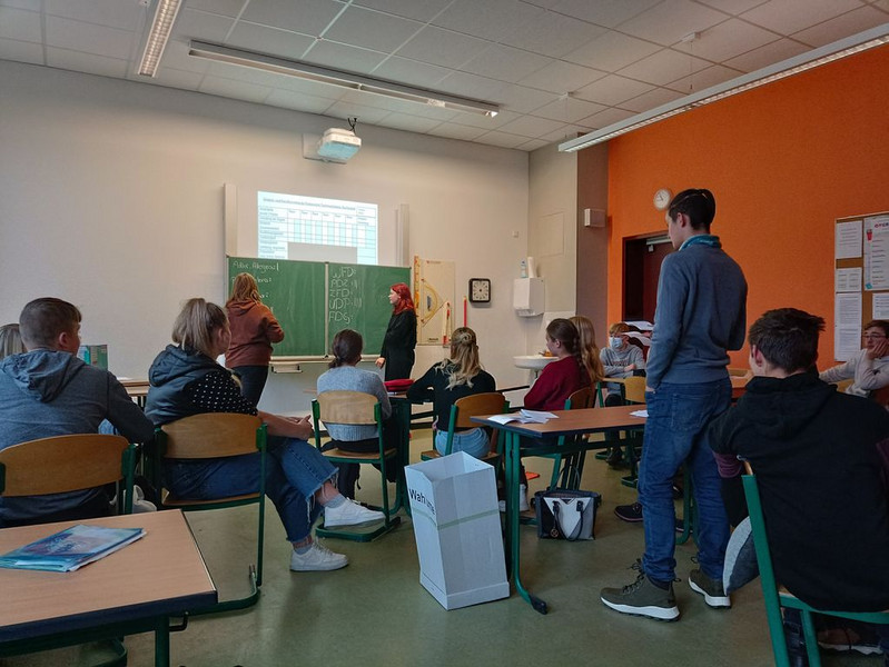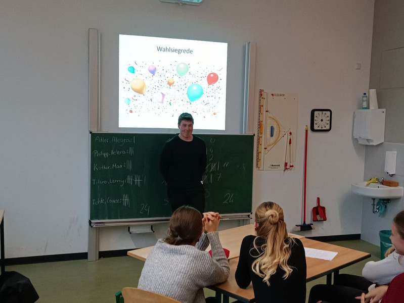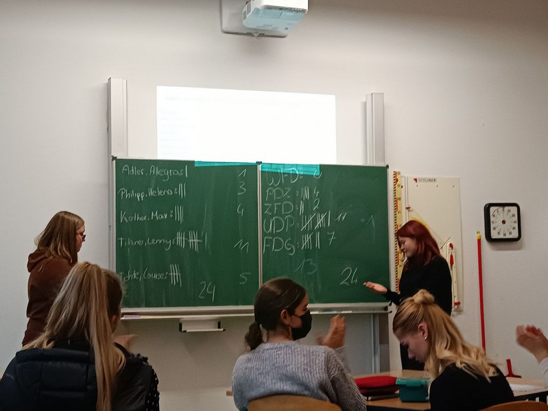 Neben dem Austausch in der Gruppe und dem damit verbundenen Finden von Kompromissen, Lösungen und guten Argumenten, konnten die Schülerinnen und Schüler ihr Wissen zum Thema Wahlen praktisch anwenden. Jeder erhielt einen extra für diese Wahl vorbereiteten Stimmzettel mit den aus der Klasse entstandenen Parteien und deren Kandidaten für die Erst- bzw. Zweitstimme. Die Wahlkampfsieger standen in der Pressekonferenz den Fragen der Journalisten zur Verfügung und kommentierten ihren Wahlsieg. Gleich im Anschluss folgten ersten Gespräche mit potentiellen Koalitionspartnern zur Bildung einer Koalition. Ob die Idee - der Erhöhung des Pfandes auf Plastikflaschen zur Verhinderung weiterer Umweltverschmutzung - sich durchsetzen wird? =)