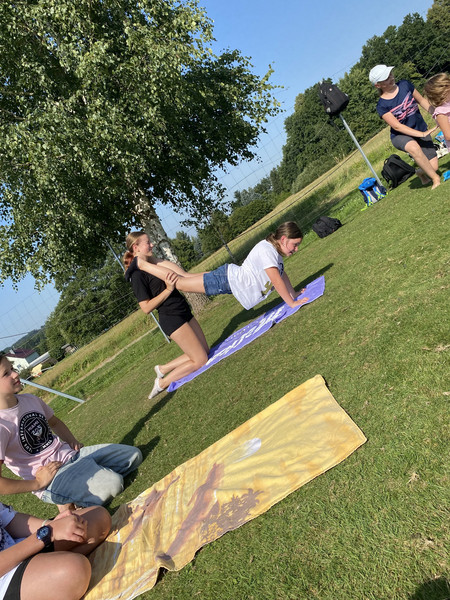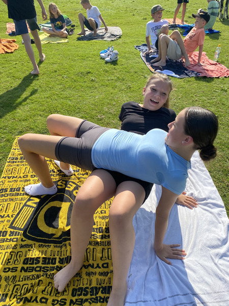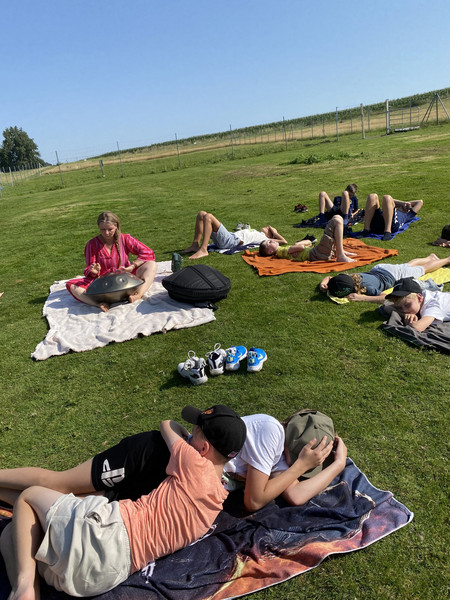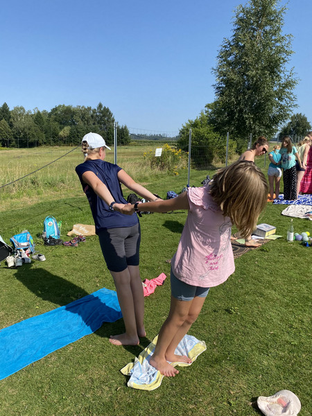 Denn als die Klassenlehrerin – selbst eher sonnenempfindlich als sonnenhungrig – unter der Hitze litt, war sofort klar: Hier wird geholfen, nicht weggeschaut! Wasser wurde gereicht, Luft zugewedelt und ein Handtuch im Bach befeuchtet, um für schnelle Abkühlung zu sorgen.