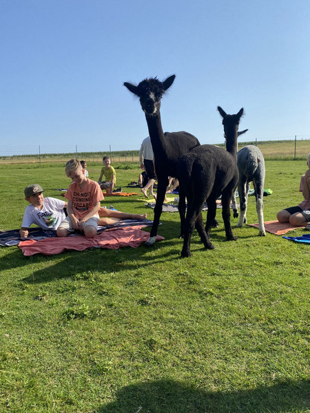 Bevor die Bewegung begann, hieß es erst einmal: runterkommen. Eine kleine Geschichte brachte alle zur Ruhe – zumindest fast alle, denn die Alpakas schienen schon voller Vorfreude auf das ungewöhnliche Schauspiel. Dann ging es los: Die Schüler und Schülerinnen verwandelten sich in Igel, Giraffen, Schlangen und Tiger – allerdings ohne die Fluchtinstinkte der Alpakas zu wecken. Im Gegenteil: Die wuscheligen Beobachter kamen teilweise erstaunlich nah. Wer Glück hatte, bekam sogar ein zartes Alpaka-Nasen-Küsschen – flauschiger geht’s kaum! Wer es nicht weiß, so bekunden Alpakas ihre Sympathie.
