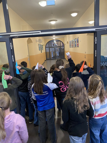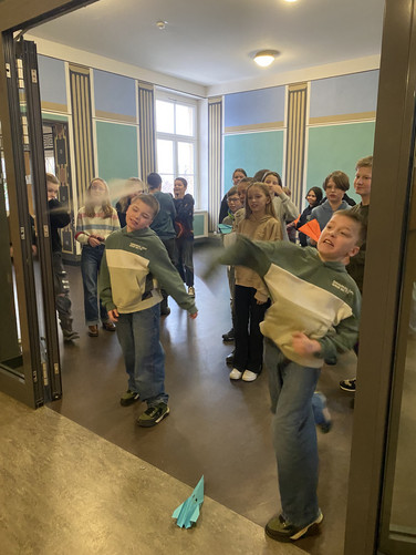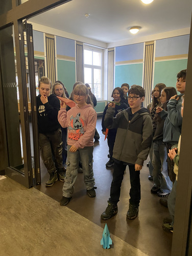 Heute ging es dann richtig in die Luft! Die 5c erforschte, wie Vögel fliegen: Sie gleiten, segeln, rudern, rütteln, schwirren und stürzen. Das Highlight der Stunde war jedoch das eigene Fliegenlassen – mit selbst gebauten Papierfliegern. Denn jeder hatte seine ganz eigene Technik, um möglichst weit zu kommen.