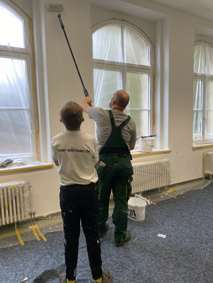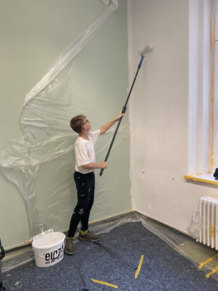 In den Herbstferien vom 6. bis 9. Oktober 2025 wurde es bunt in der Schule. Schülerinnen und Schüler der 7. und 8. Klasse verwandelten zwei Klassenräume in echte Hingucker. Mit viel Einsatz und unter fachkundiger Anleitung des Malerbetriebs Dietzel wurde abgeklebt, gemalt und kreativ gestaltet. Die Farben – ein frisches Gelb und ein frühlingshaftes Grün – wurden vom Betrieb gesponsert und sorgen jetzt für eine freundliche Lernatmosphäre, in der sich der Schulalltag bestimmt gleich leichter anfühlt.