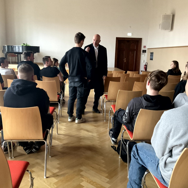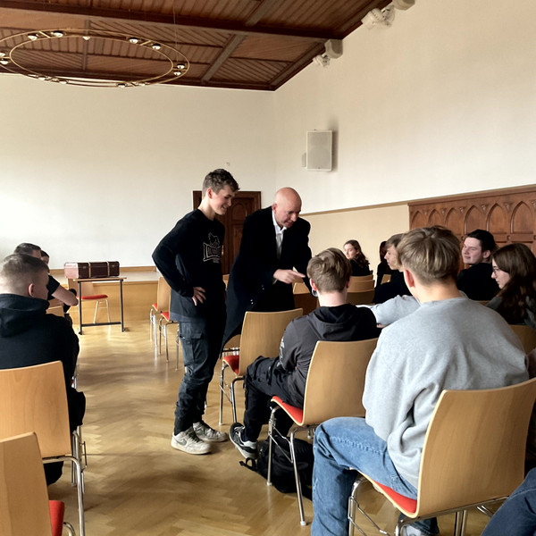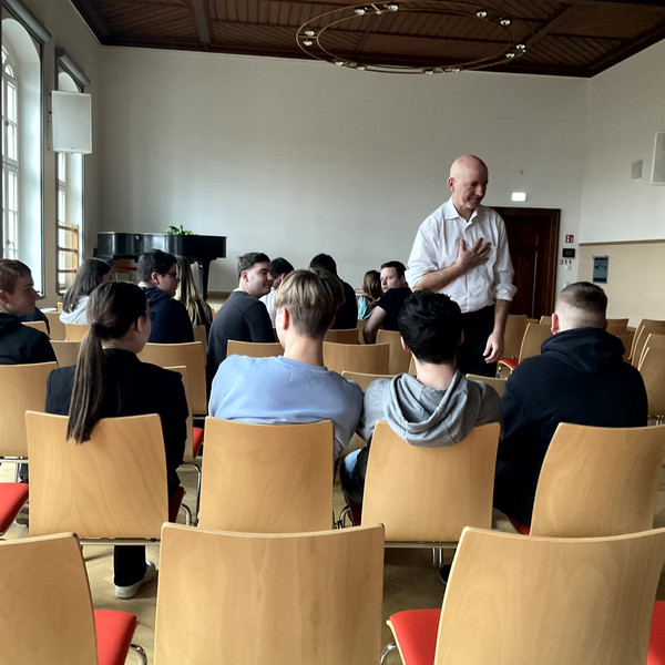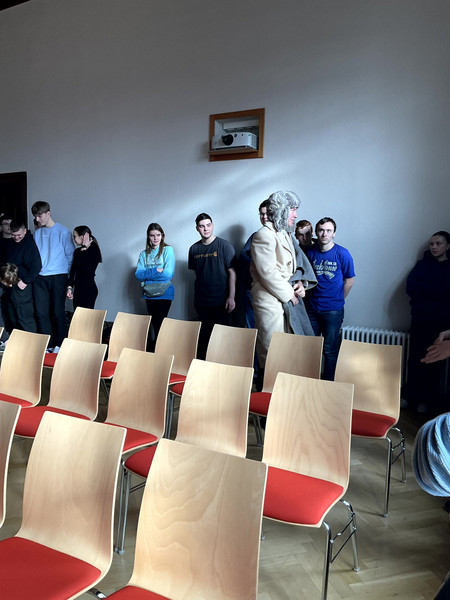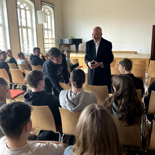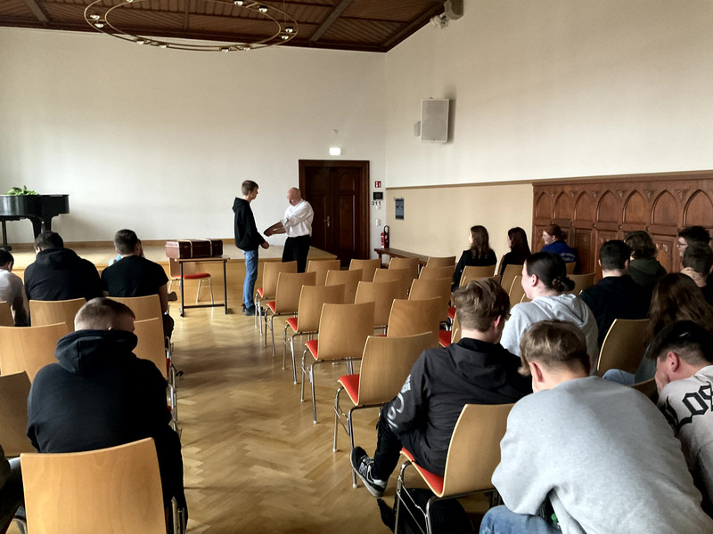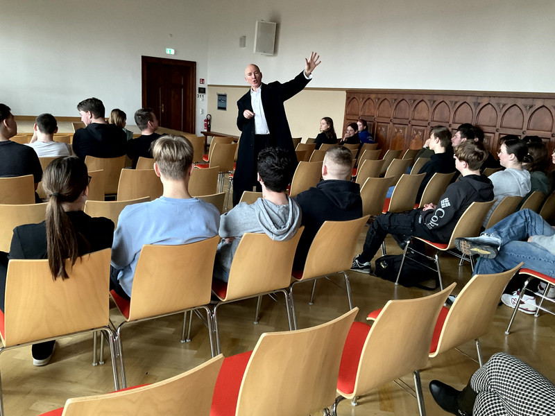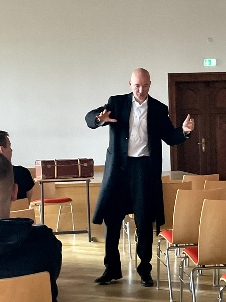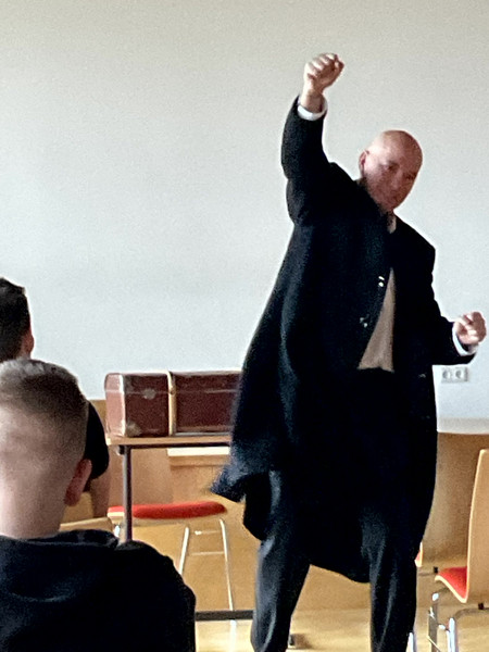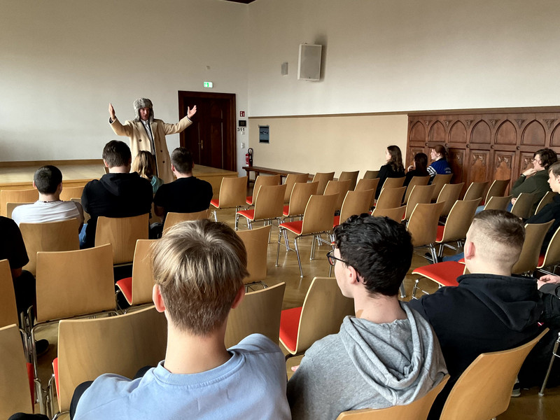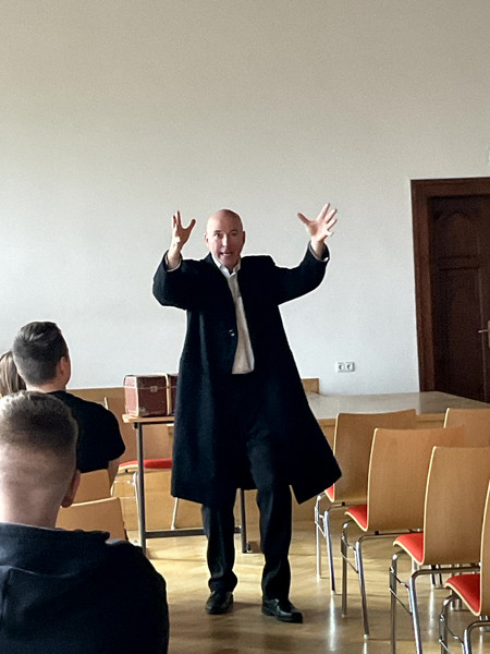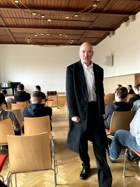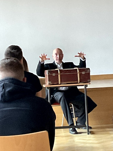 Dabei wurde der Schulstoff zu Goethes Lebenswerk in eine kurze Inszenierung gebracht. Rasant erzählte Steffen Pietsch, Schauspieler der Landesbühnen Sachsen, dieses umfangreiche Werk um den Doktor Heinrich Faust, der begreifen möchte, was die Welt im Innersten zusammenhält.