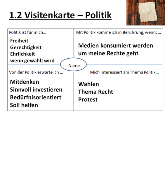 Um diese Frage zu beantworten, haben wir ein spannendes Projekt gestartet. Jeder von uns erhielt vorgegebene Satzanfänge, die wir mit unseren eigenen Gedanken und Ideen vervollständigen sollten. Das Ergebnis waren 23 einzigartige "Visitenkarten" – kleine Einblicke in unsere individuellen Vorstellungen von Politik.