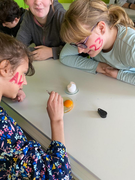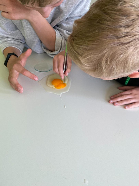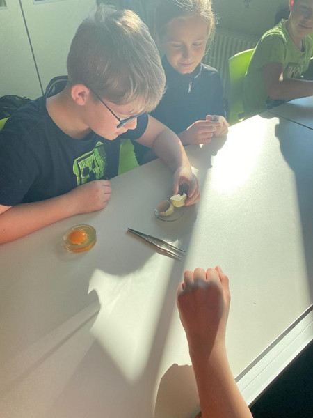 Die Gruppen haben am praktischen Beispiel gelernt, wie dünn die Membran um das Eigelb ist, die Keimscheibe auf dem Dotter zu lokalisieren und wie lang man die Hagelschnüre ziehen kann. Dankeschön an alle Hennen, die uns tatkräftig durch Eier unterstützt haben und an die Schülerinnen und Schüler, die mindestens eins davon unversehrt mit in die Schule gebracht haben.