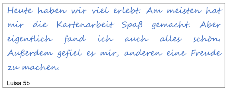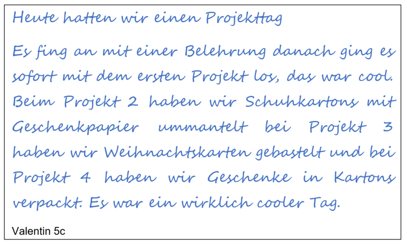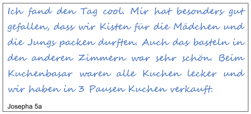 Aber dem nicht genug: Während unseres Projekttages ging es auch um die weltweit größte Geschenkaktion für Kinder in Not. Die Schülerinnen und Schüler erkundeten beispielsweise die Zielländer und bastelten Weihnachtskarten in liebevoller und akribischer Handarbeit. Alle hatten während des gesamten Tages sichtlich Freude und Spaß.