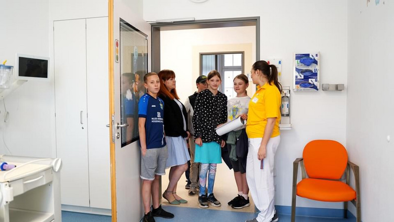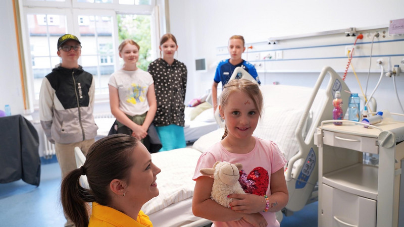 Mia, Yasmin, Luca, Pascal und Fabio der Diesterweg-Oberschule kamen heute stellvertretend für alle Läufer in unsere Kinderklinik, um den Scheck zu überbringen. Vom Geld werden neue Spiel- und Sportgeräte für unsere jungen Patienten angeschafft. „Die neuen Spielsachen und Spielgeräte können helfen, den Krankenhausaufenthalt für Kinder zu erleichtern, und bestenfalls verbessert sich der Heilungsverlauf“, sagt der Chefarzt, der die Schülerinnen und Schüler auf eine kleine Stärkung und zu einem Rundgang durch die Klinik einlud. Die kleine Leonie bezog vor einigen Tagen ihr Krankenbettchen auf der Station F240 und freute sich sehr über den Besuch.