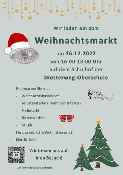 Es wird einen Flohmarkt geben, Schüler der Klassen 5 und 6 verkaufen Weihnachtskarten und weihnachtliche Basteleien. Für das leibliche Wohl ist selbstverständlich gesorgt.