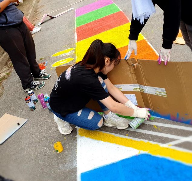 Um auch schon kurzfristig etwas von den Wünschen unserer Schüler:innen umsetzen zu können, wurde in einem gemeinsamen Arbeitsprozess mit Frau Israel und Frau Herdler-Hennig ein Kunstprojekt mit der Klasse 8c entwickelt. Unsere Schüler:innen machten sich zunächst einen Plan für die Farbgestaltung des Schulhofes, testeten das Ganze zunächst mit einem Kreideentwurf und setzten das Projekt in der letzten Schulwoche um.