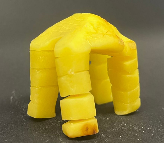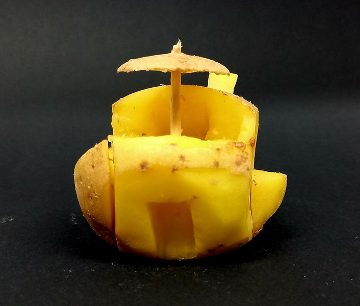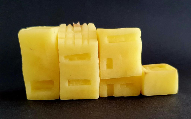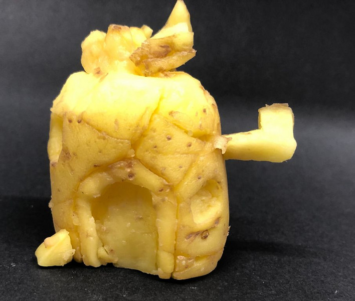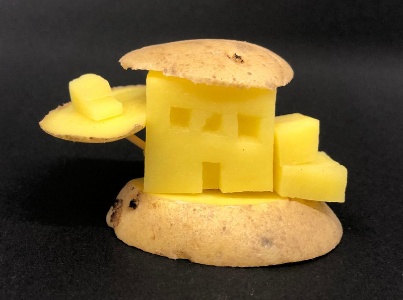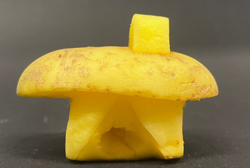 Als alternatives und kostengünstiges Arbeitsmaterial haben wir die Kartoffel zum Schnitzen verwendet. Aufgabe war es in dieser Übungseinheit, eine Gebäudeform aus nur einer Kartoffel zu entwickeln.