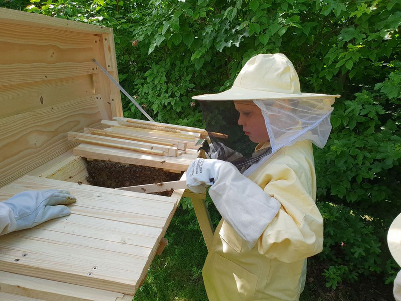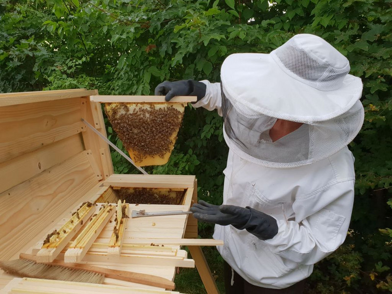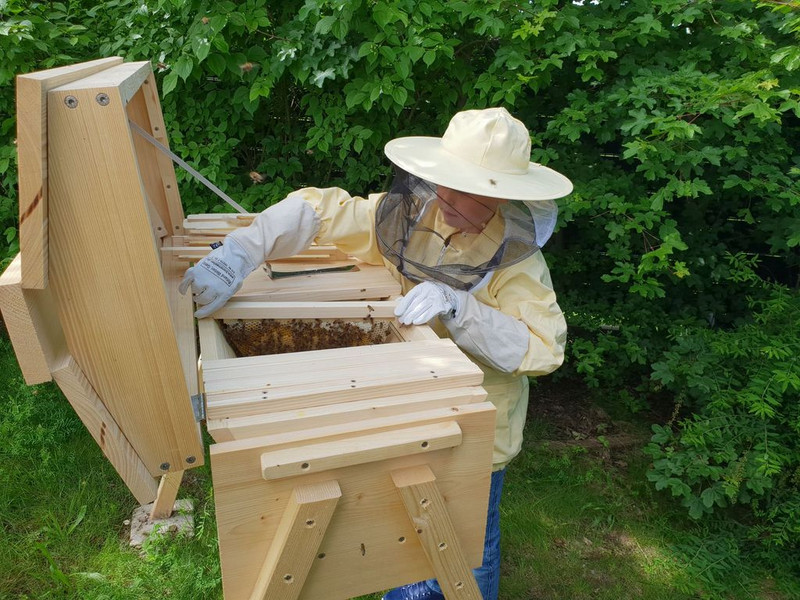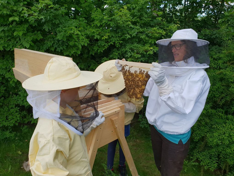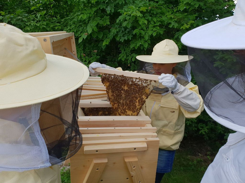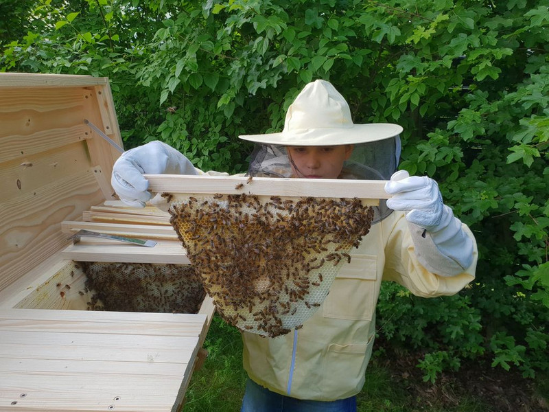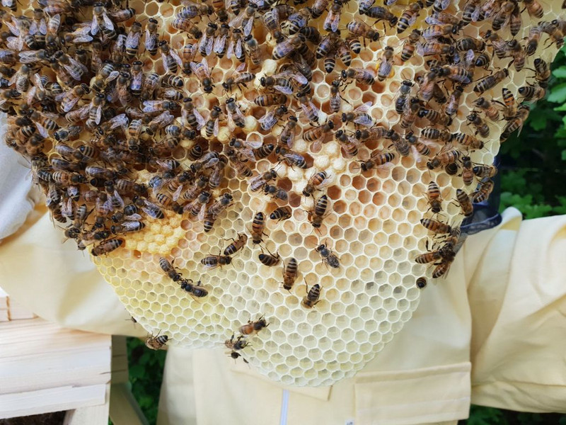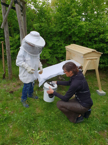 Nachdem es dann doch aufgehört hatte zu regnen, statteten wir gemeinsam unseren Bienen einen Besuch ab. Ob heute wohl junge Brut zu finden ist?