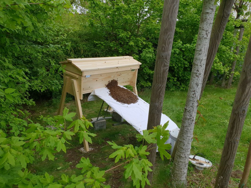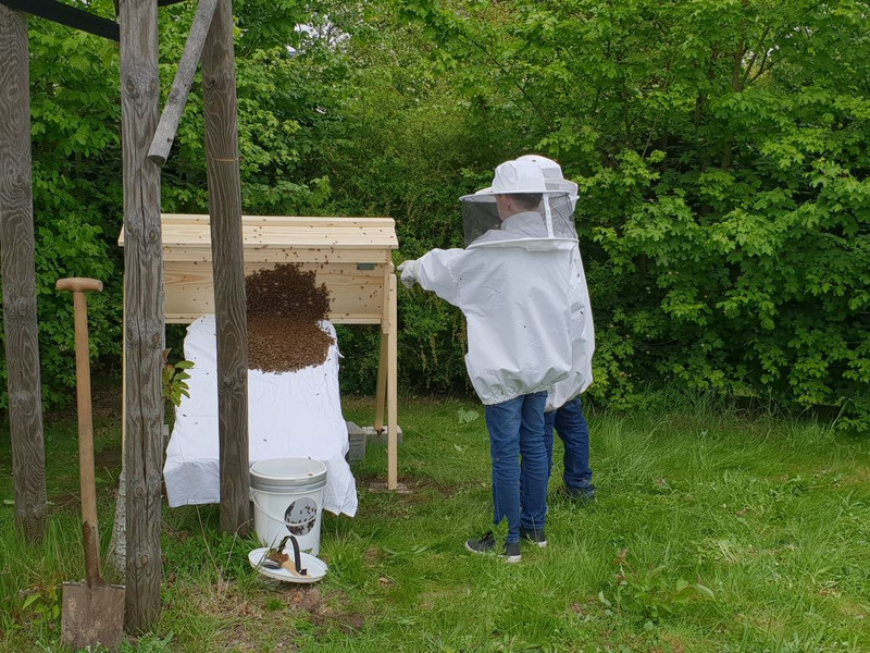 Es ist so weit. Wir haben einen frisch abgegangen Bienenschwarm geschenkt bekommen und ihn am späten Nachmittag einlaufen lassen. Ein tolles Erlebnis.