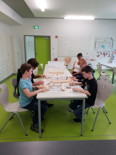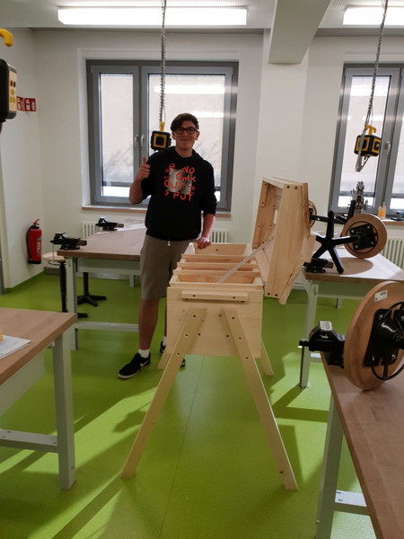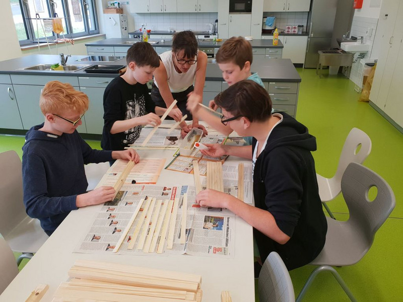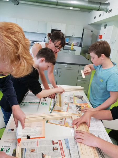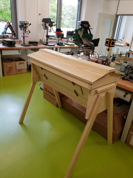 Fleißig haben zwei Schüler aus der 9. Klasse zusammen mit drei Fünftklässlern vor den Ferien beim ersten Treffen der Jungimker begonnen, das Bienenhaus zu bauen. Es ist eine Ökobeute vom Typ Top Bar Hive.