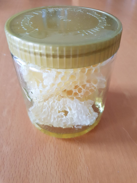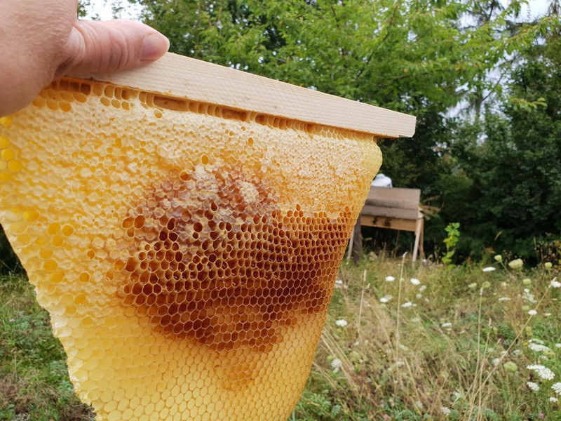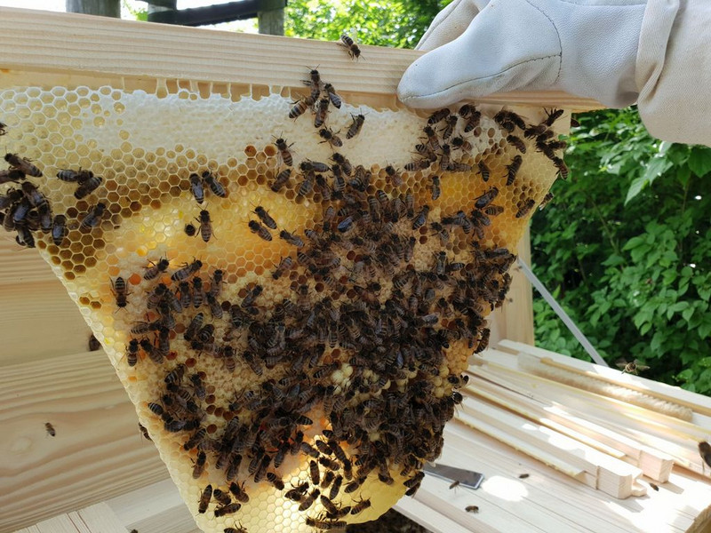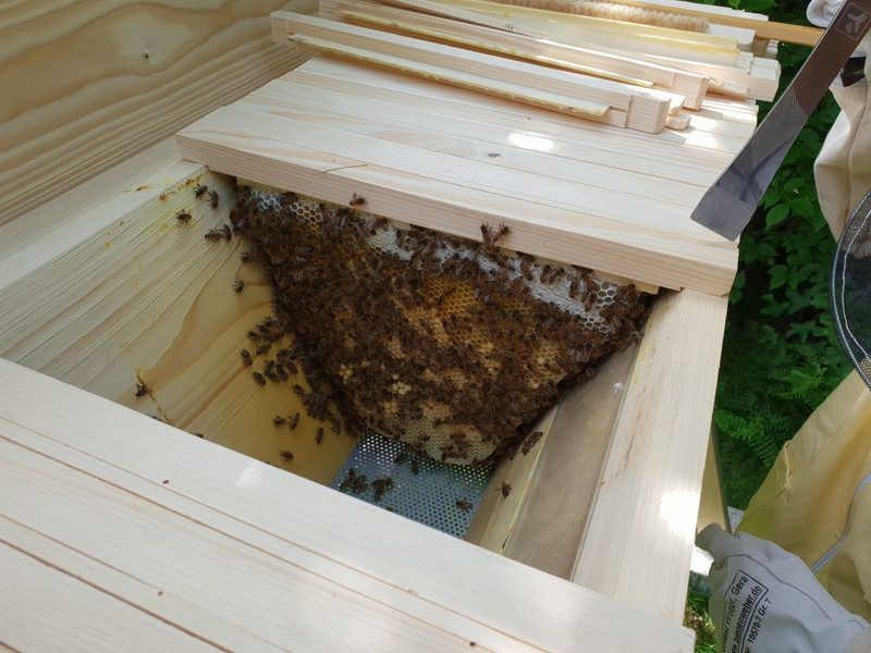 Zuvor machen wir noch eine Durchsicht. Mit großer Freude stellen wir fest, dass unsere Bienen sehr viel Honig eingelagert haben. Wir entschließen uns, eine Wabe zu mopsen und freuen uns schon auf den Honigschmaus.