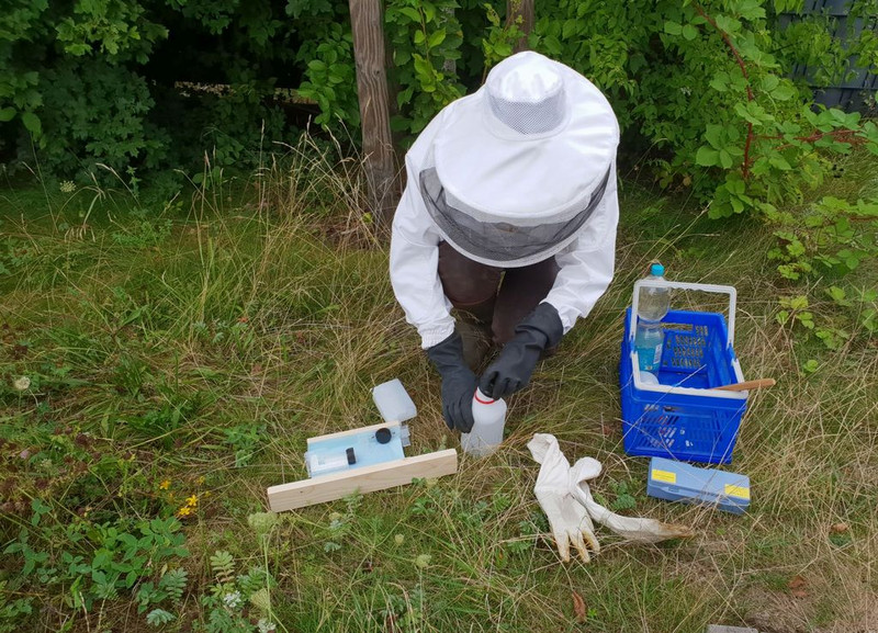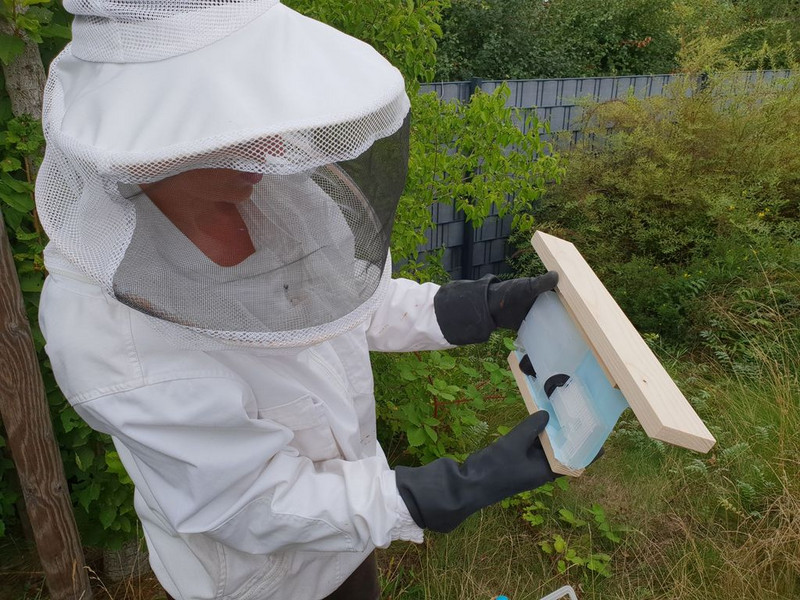 Noch sind Ferien, aber die Bienen haben schon unsere volle Ausmerksamkeit. Nach einer Varroakontrolle über einige Tage ist es heute es so weit. Unser junges Volk muss seine erste Varroabehandlung bekommen. Sorgsam bereiten wir die Ameisensäure vor und stellen alles bereit.