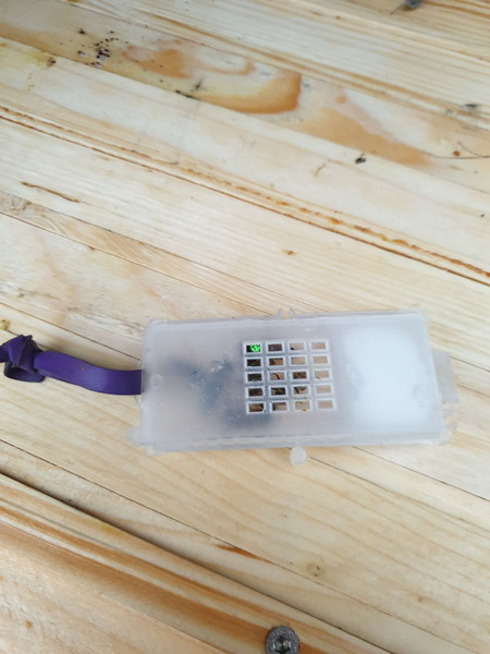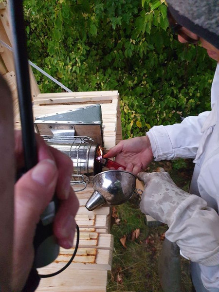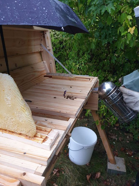 Damit unser Volk eine reelle Chance hat über den Winter zu kommen, haben wir uns entschlossen eine neue Königin zu kaufen. Heute kam sie nun mit der Post. In einer Kunststoffbox und einigen Begleitbienen ist die Königin mit der grünen 77 jetzt unsere Hoffnung. Trotz Regenwetter haben wir uns aufgemacht, um sie gleich einzuhängen. Gar nicht so einfach, den Smoker anzufeuern und die etwas aufgewühlten Bienen zu beschirmen. Zum Ende gab es auch noch etwas Futter für unsere Bienenmädels.