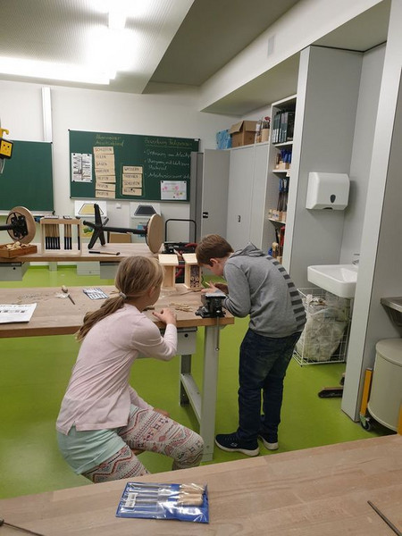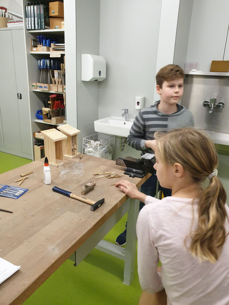 Damit so schnell wie möglich unser Bienenvolk "einziehen" kann, hat Mark am Dienstag während der AG Holzwürmer zusammen mit Frau Wiedemann die Beute fertiggestellt.
